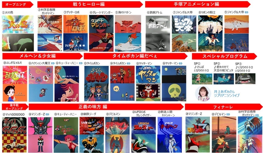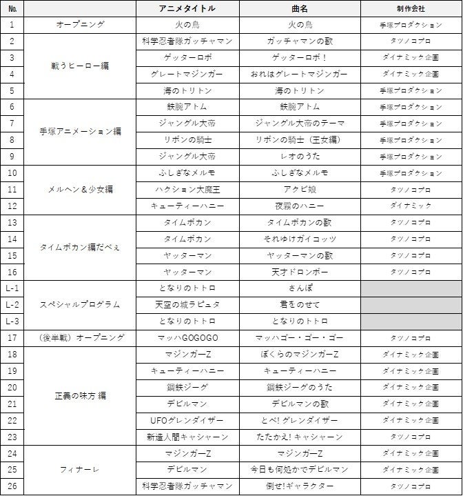 主題歌26曲+スペシャルプログラム3曲の全29曲のアニソンで構成 ※EDはエンディング曲