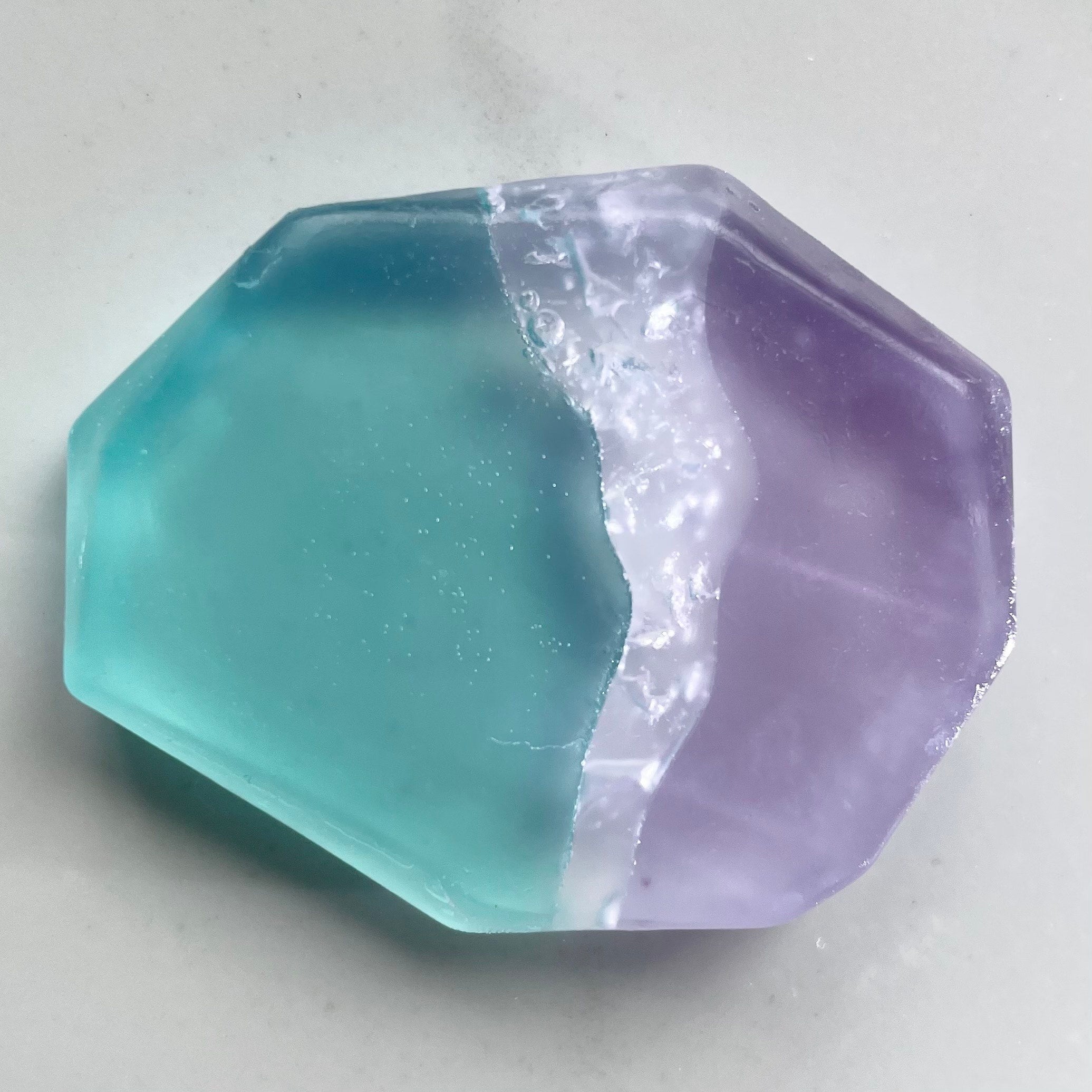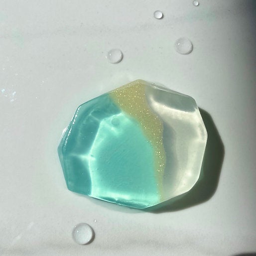青く透き通る宝石石鹸。海の宝石と呼ばれるアクアマリンのような輝きを込めました。