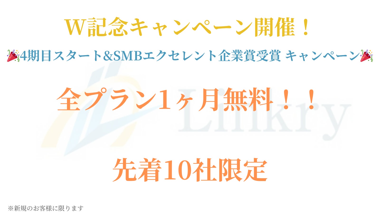 4期目スタート&SMBエクセレント企業賞受賞を記念し、10社限定で全プラン1ヶ月無料キャンペーンを実施します!