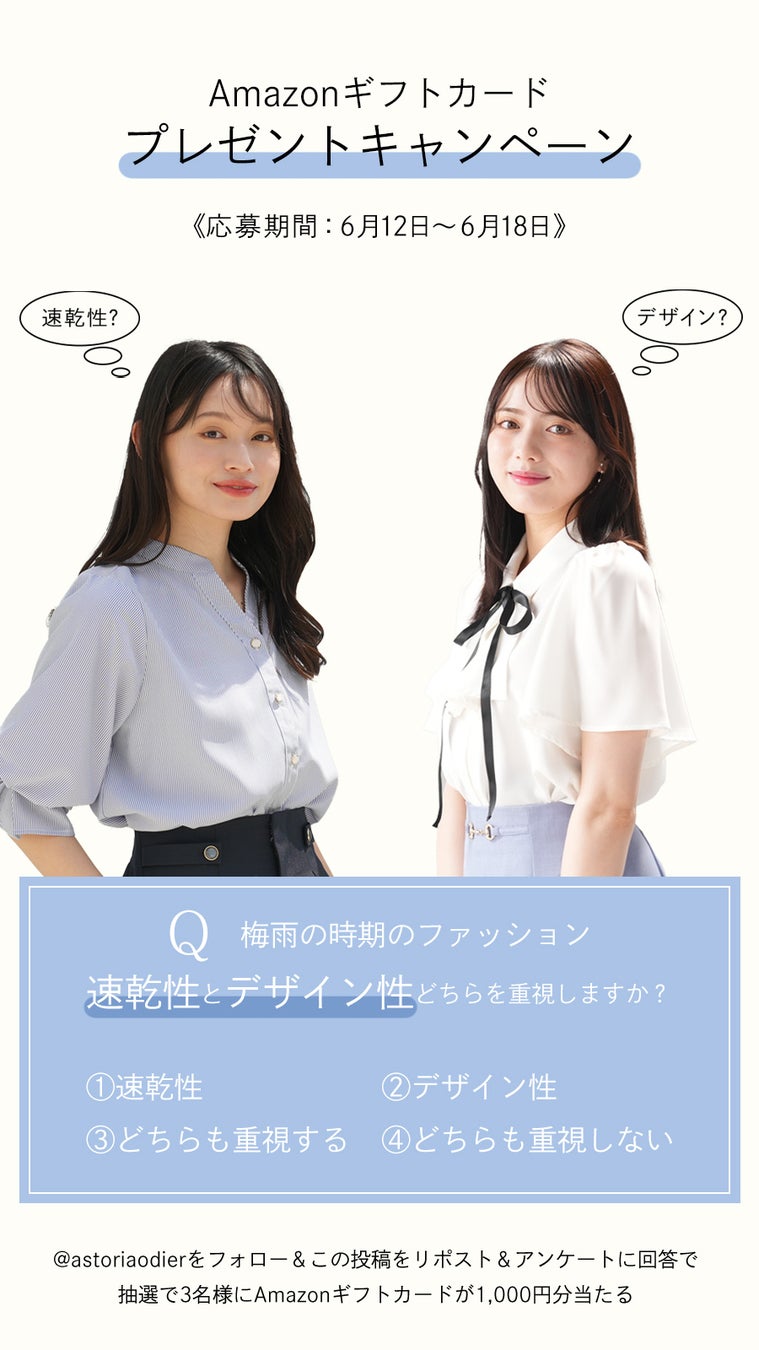 梅雨時期は、湿度が高く汗ばむことに加えて、突然の雨もあることから服選びに悩まされる季節です。とくに通勤やお出かけといったシーンでは、「清潔感のあるきちんとした印象」と「快適に過ごせる機能性」の両立が求められます。アストリアオディールでは、X(旧Twitter)でのアンケート結果をもとに、多くのお客様が【速乾性】と【デザイン性】の両立を重視していることを確認しました。そうしたニーズに応えるべく、雨の日でも美しく、自分らしくいられるスタイリング提案を軸に、本キャンペーンを企画しております。
