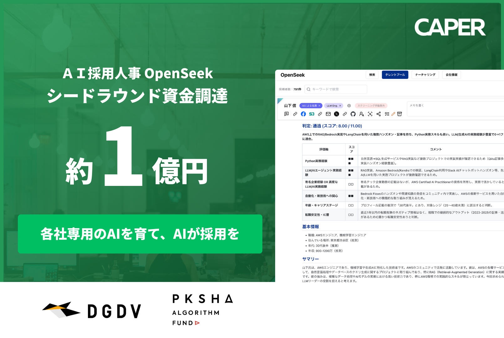 株式会社CAPER(本社:東京都渋谷区、代表取締役:山下 俊、以下 CAPER)は、DG Daiwa Ventures、PKSHA Algorithm Fund、複数のエンジェル投資家を引受先とする第三者割当増資により、シードラウンドにおいて累計1億円超の資金調達を実施しました。