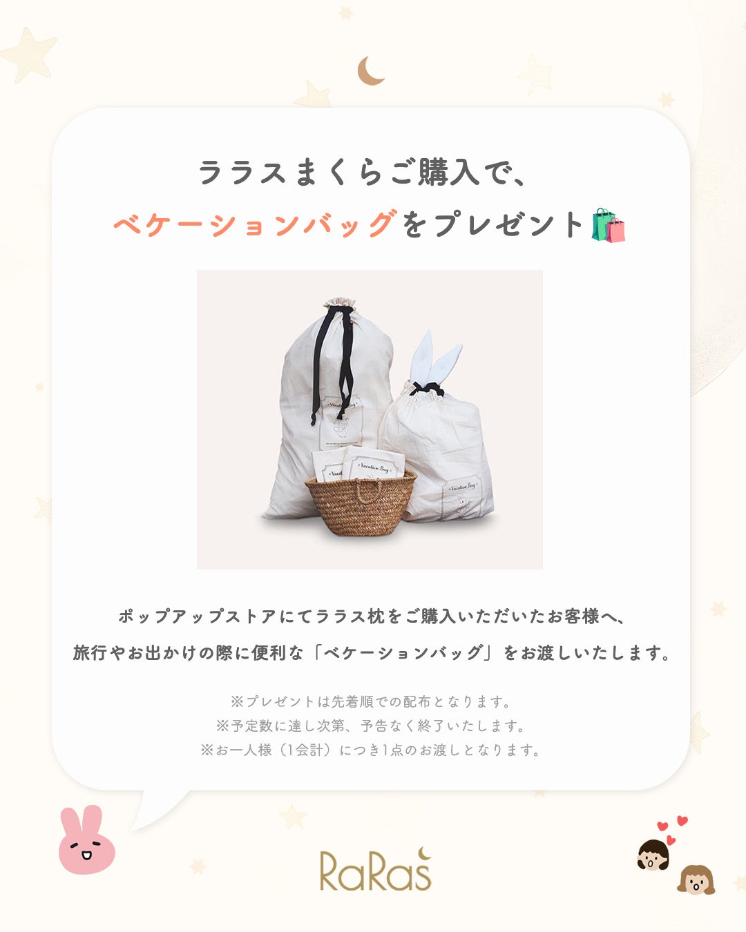 ポップアップストアにてララス枕をご購入いただいたお客様へ、旅行やお出かけの際に便利な「ベケーションバッグ」をお渡しいたします。