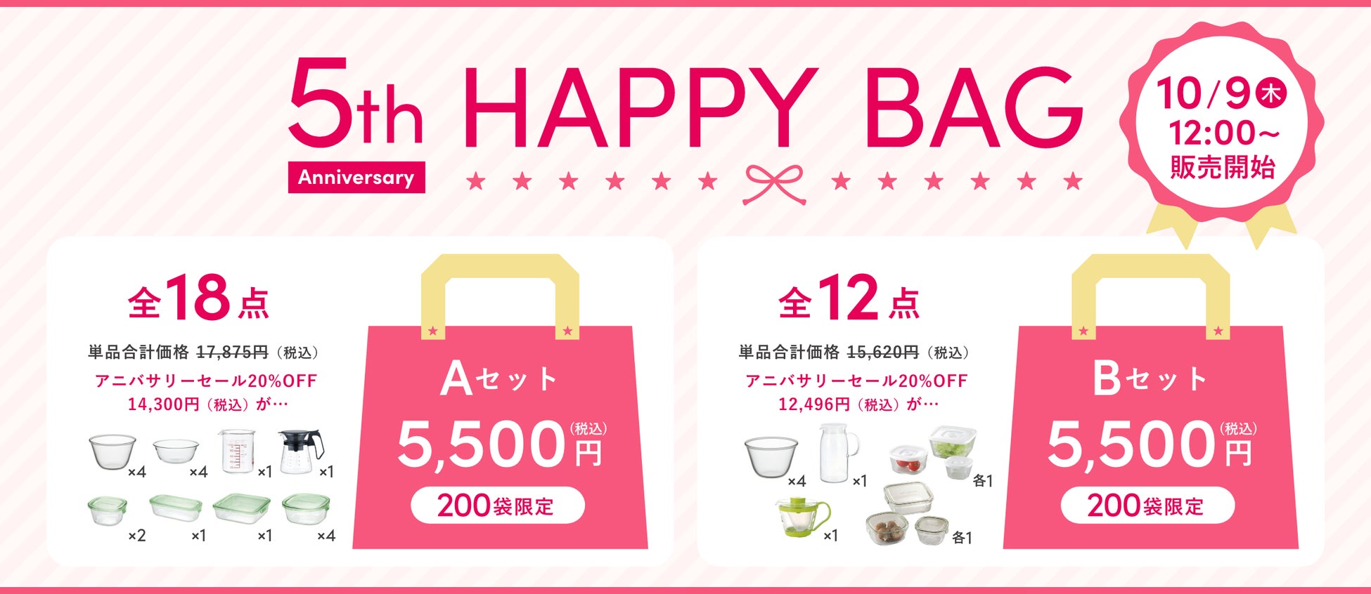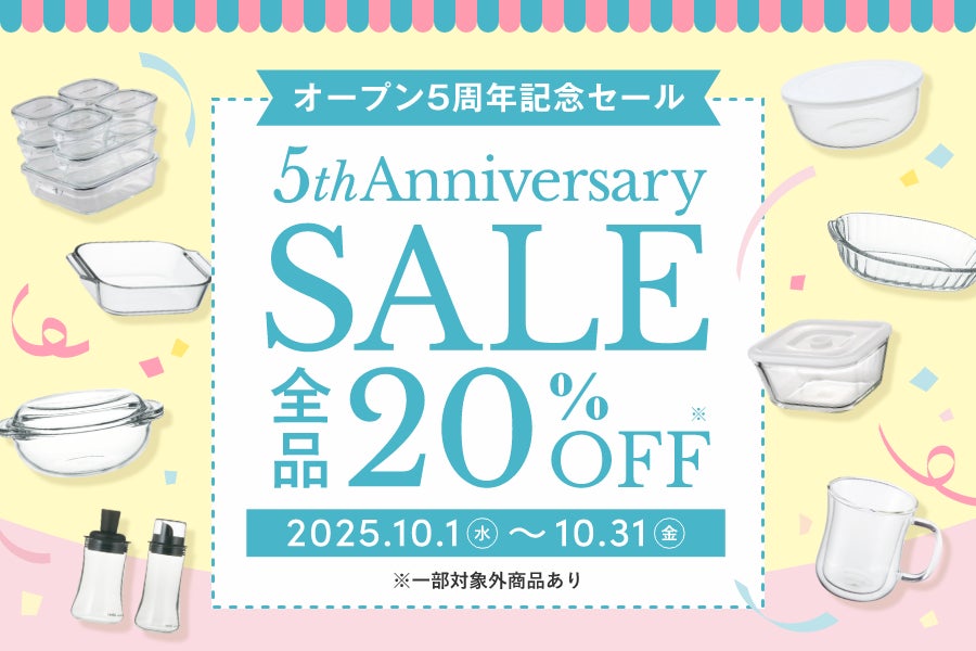 AGCテクノグラス株式会社(本社:静岡県)は、iwaki公式Webショップのオープン5周年を記念し、2025年10月1日(水)~10月31日(金)の期間、「アニバーサリーセール」を開催します。期間中は全品20%OFFの特別価格で提供します。(一部を除く)さらに、通常は年末のみ販売している福袋を5周年記念セットにして特別にご用意しました。福袋は数量限定、売り切れ次第終了となります。
