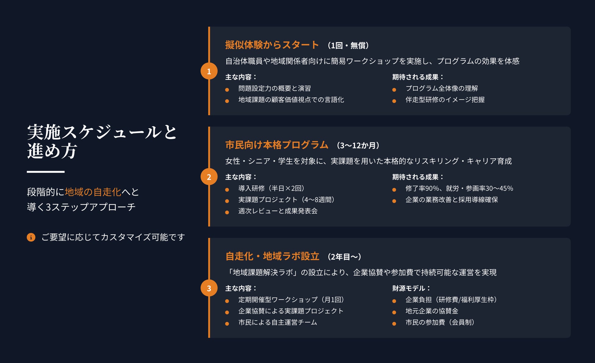 STEP 2: 市民向け本格プログラム (3~12か月) 女性・シニア・学生を対象に、実課題を用いた本格的なリスキリング・キャリア育成を実施。就労・地域定着をゴールに伴走支援します。
