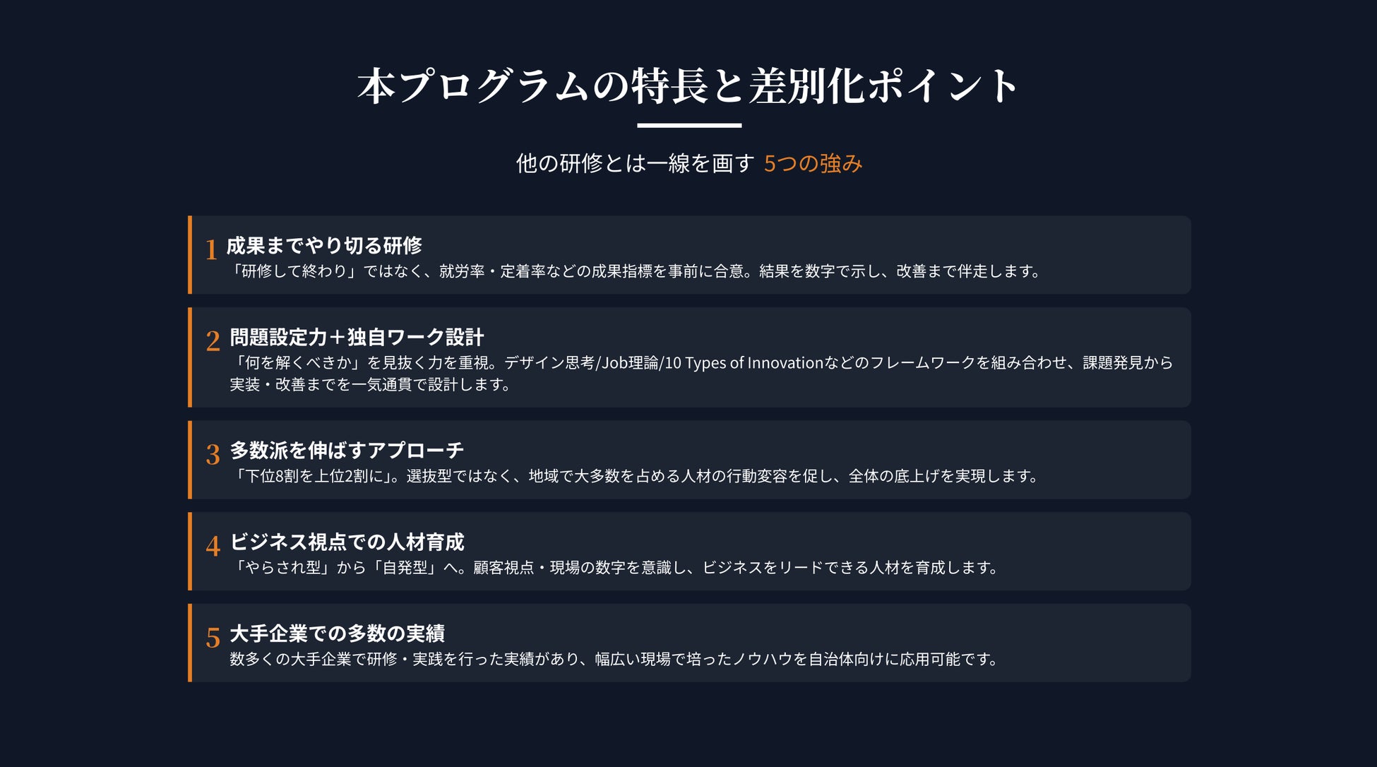 成果までやり切る研修: 「研修して終わり」ではなく、就労率・定着率などの成果指標を事前に合意し 、改善まで伴走します。