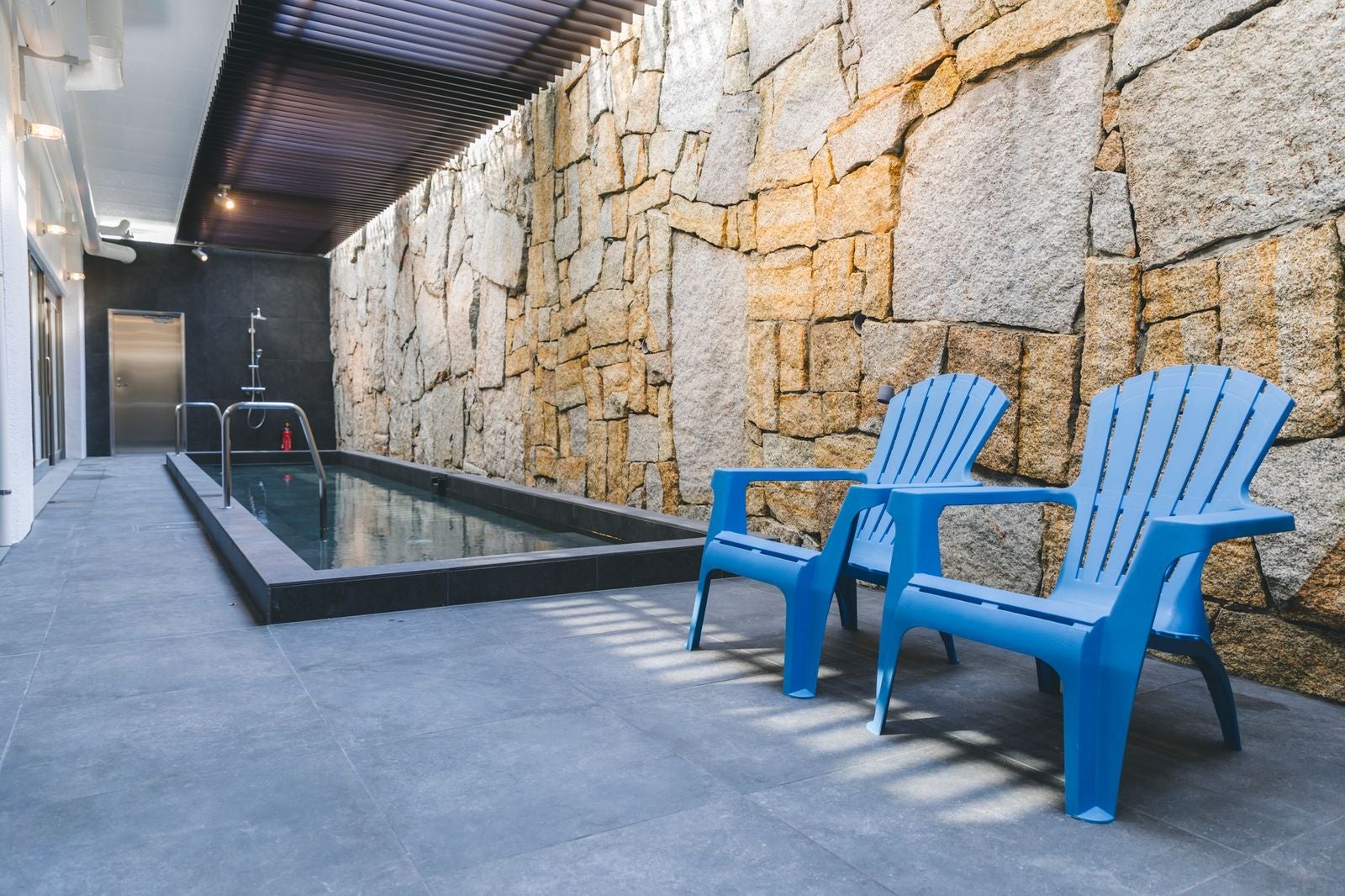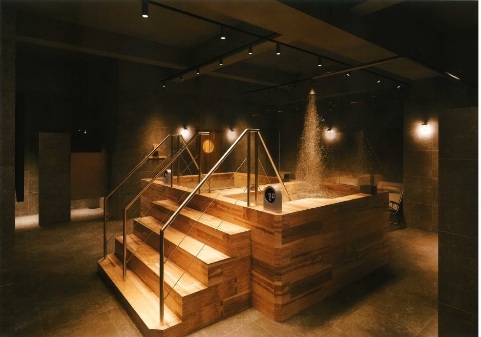 水温はシングル(10℃未満)。浴槽の四隅から対角線上にジェットが噴き出し、中央で交差する特殊設計です。中央部にはボタン操作で真上から水が落ちる打たせ水の仕掛けも設置。5方向からの水圧を受けられる日本初のクロスカウンター水風呂です。水深は、”いいサウナ”に合わせた1.37m。肩まで浸かりながら全身を冷やし、ジェット水の刺激で病みつきになる日本唯一の水風呂が完成しました。頭から汗を流せば潜水も可能です。