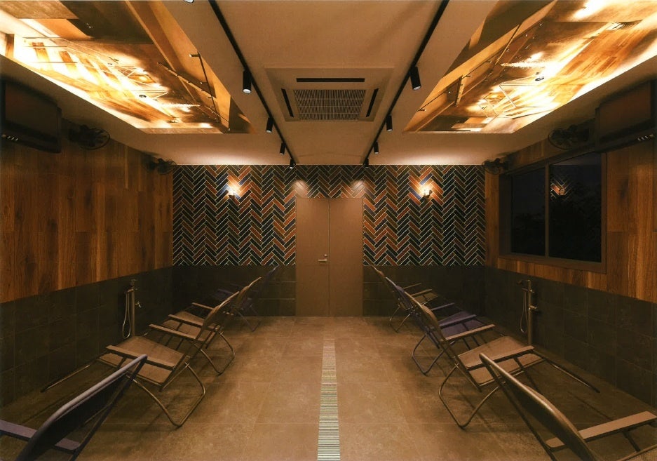 ベンチには、一般的な雛壇形式に加えてロフト構造の座面を導入しました。上段は熱気をたっぷり感じたい高温志向派に、下段にはリクライニングチェアを設置しています。座面の高さを変えることで温度調整が可能ですので、お好きな高さをお選びいただけます。