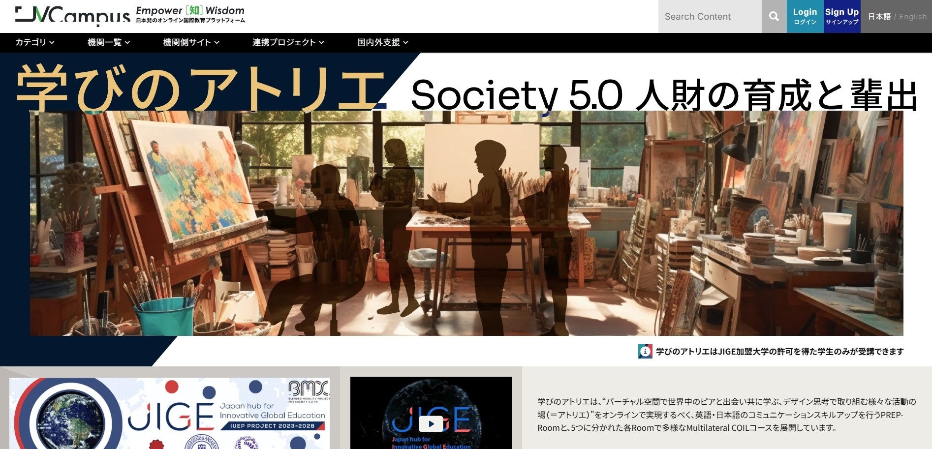 その取り組みの一環として、JV-Campusは、本フォーラム主催のJapan Hub for Innovative Global Education(JIGE)による「JIGE 学びのアトリエ」や「JIGEインターンシップ」サイトをJV-Campusポータル上で提供しています。