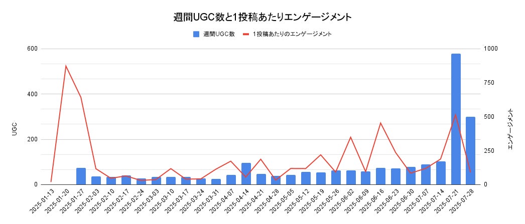 翌週(7/28–8/4)は投稿299件/エンゲージメント26,793件と高水準を維持し、オープン直後の熱量が継続していることを確認しました。