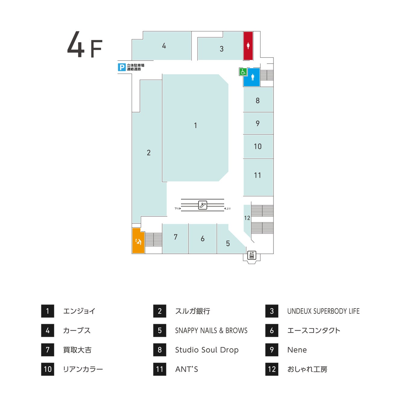 落ち着いた夜空をイメージしたカラーで統一された4階には、日常生活を支えるサービス系店舗が並びます。