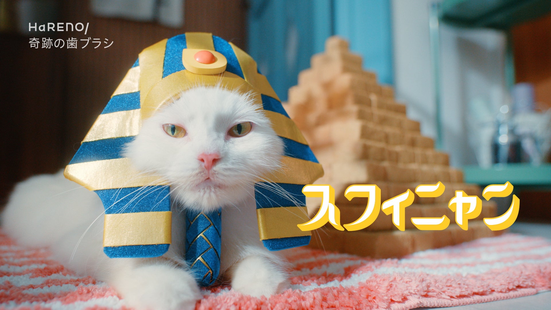 本CMでは、歯みがきに悩む女性の前に、「奇跡の歯ブラシ」のピラミッド形状にちなんで生まれた猫のキャラクター「スフィニャン」が登場します。