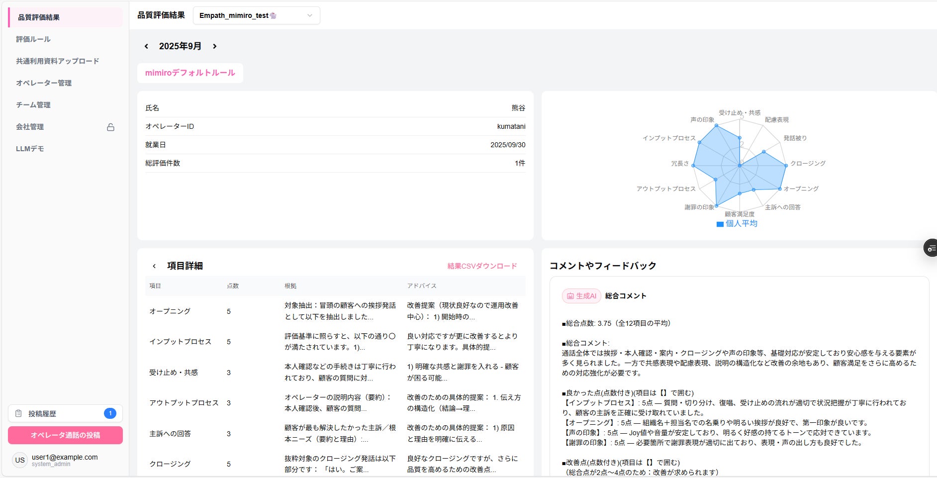 各通話を項目ごとにスコアリングし、根拠や改善アドバイスを含むレポートが自動生成されます。さらに、オペレーターごとの成績を一覧表示するダッシュボード機能も搭載。