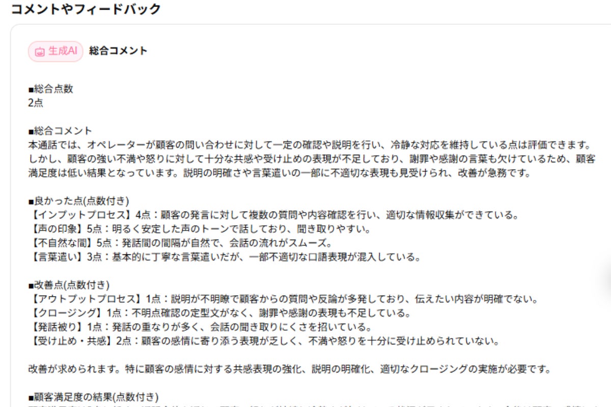 忙しい管理者でも、「誰が要指導か」「どの点を改善すべきか」を一目で把握できます。 AIによる客観的な評価とわかりやすいレポートにより、品質向上サイクルを効率化します。