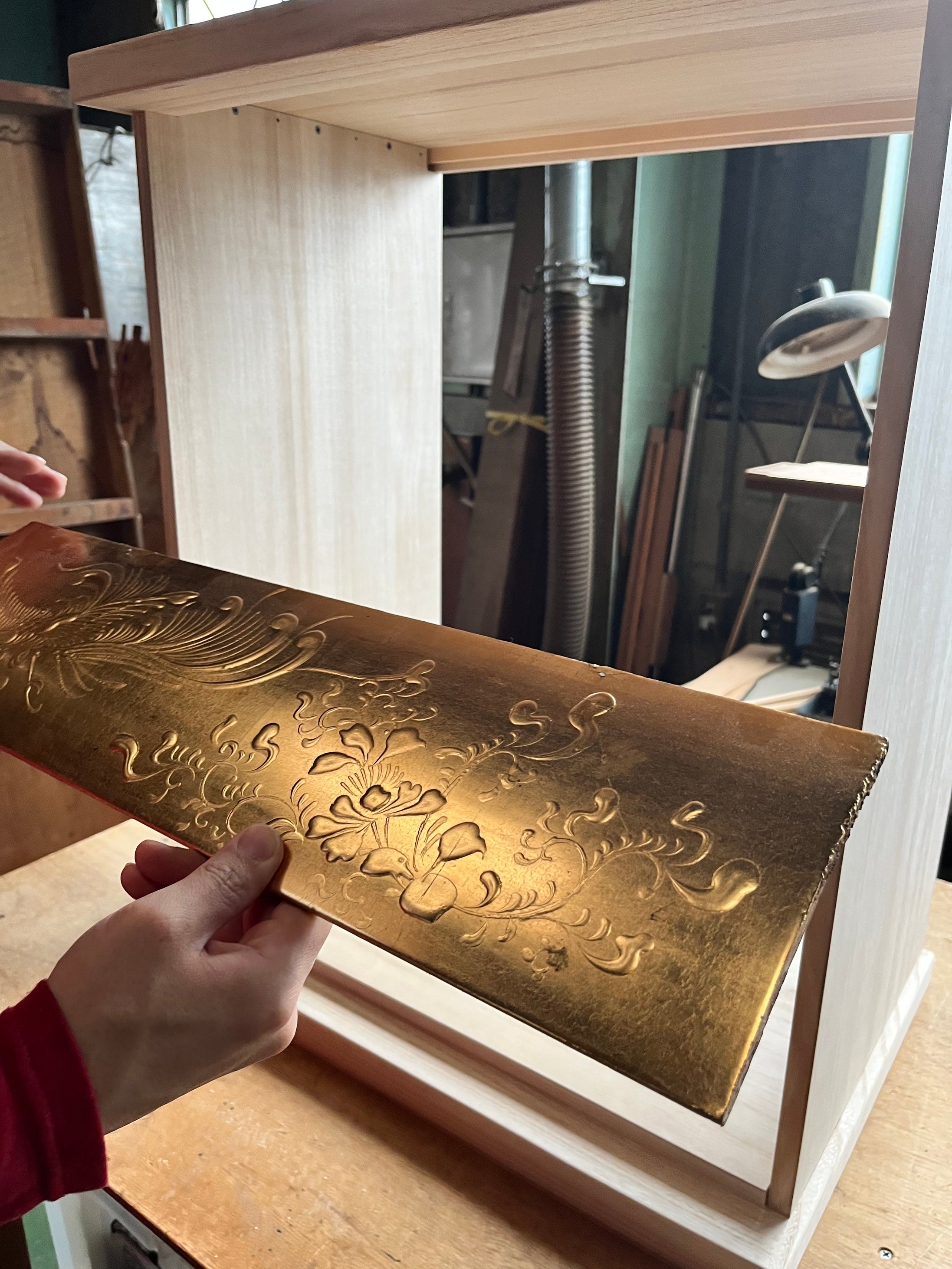金具細工:装飾金具を磨き直し、新しい配置で意匠性を高める。アクセントとして現代家具にも調和。 蒔絵(まきえ)装飾:漆面に金粉で文様を施す伝統技法。再塗装のうえで照明に反射する“光の祈り”として表現。