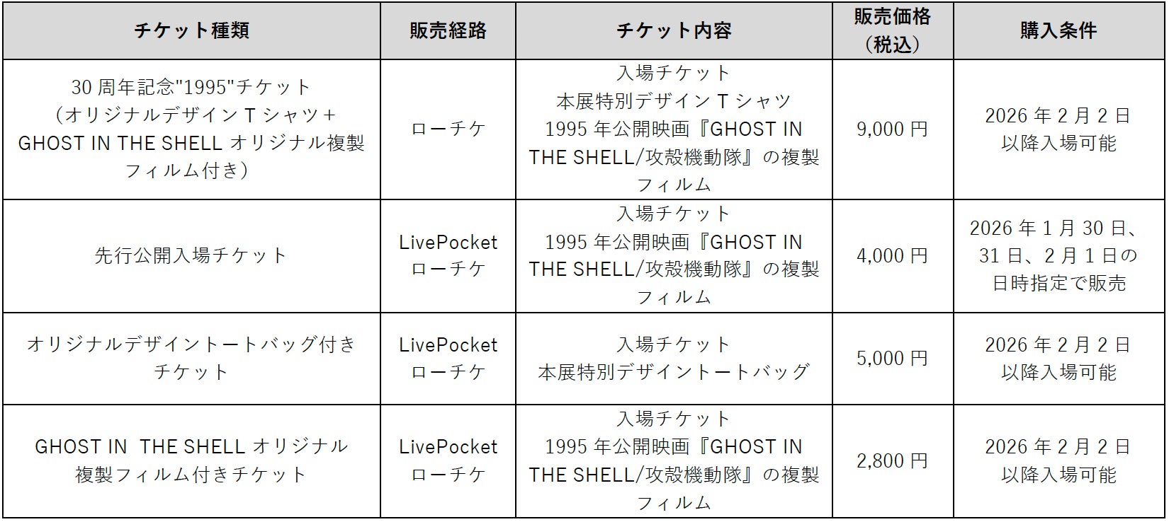 <LivePocket>https://sp.livepocket.jp/exhibition-ghostintheshell <ローチケ>https://l-tike.com/ghostintheshell-ex/ ※プレイガイド別に購入できるチケットが異なりますので、ご注意ください ※各チケット詳細は、公式ホームページにて、公開されます |