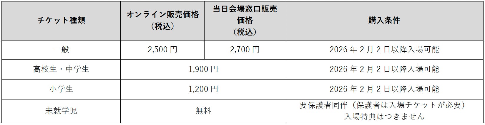 今回は、通常入場チケットのほか、3種類の特典付き入場チケットと、開幕初日から3日間(2026年1月30日、31日、2月1日)限定で発売する特別先行チケット(特典付き)をご用意いたしました。