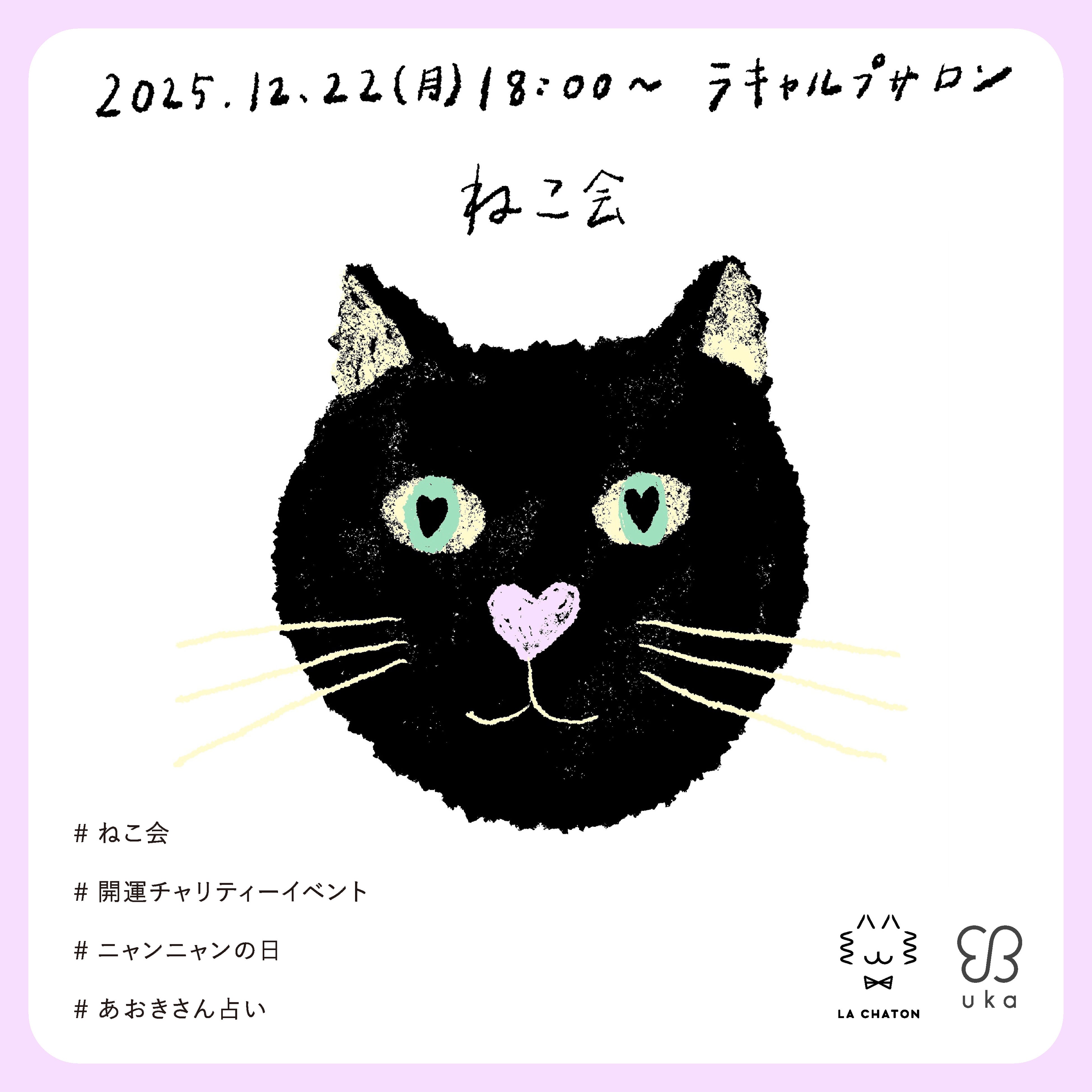 株式会社ラシャトン(東京都渋谷区、代表取締役:新井ミホ)が展開する保護猫支援ブランド<ラシャトン>は、12月22日(にゃんにゃんの日)にウカとのコラボ企画「第7回開運チャリティーイベント」を開催いたしました。