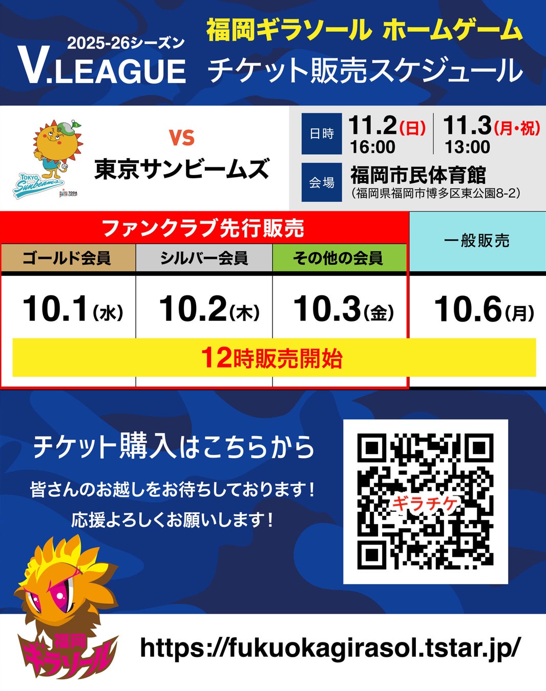 福岡ギラソール(福岡県福岡市)は、2025-26 V.LEAGUE WOMEN ホームゲームを11月2日(日)、3日(月・祝日)、福岡市民体育館にて開催いたします!