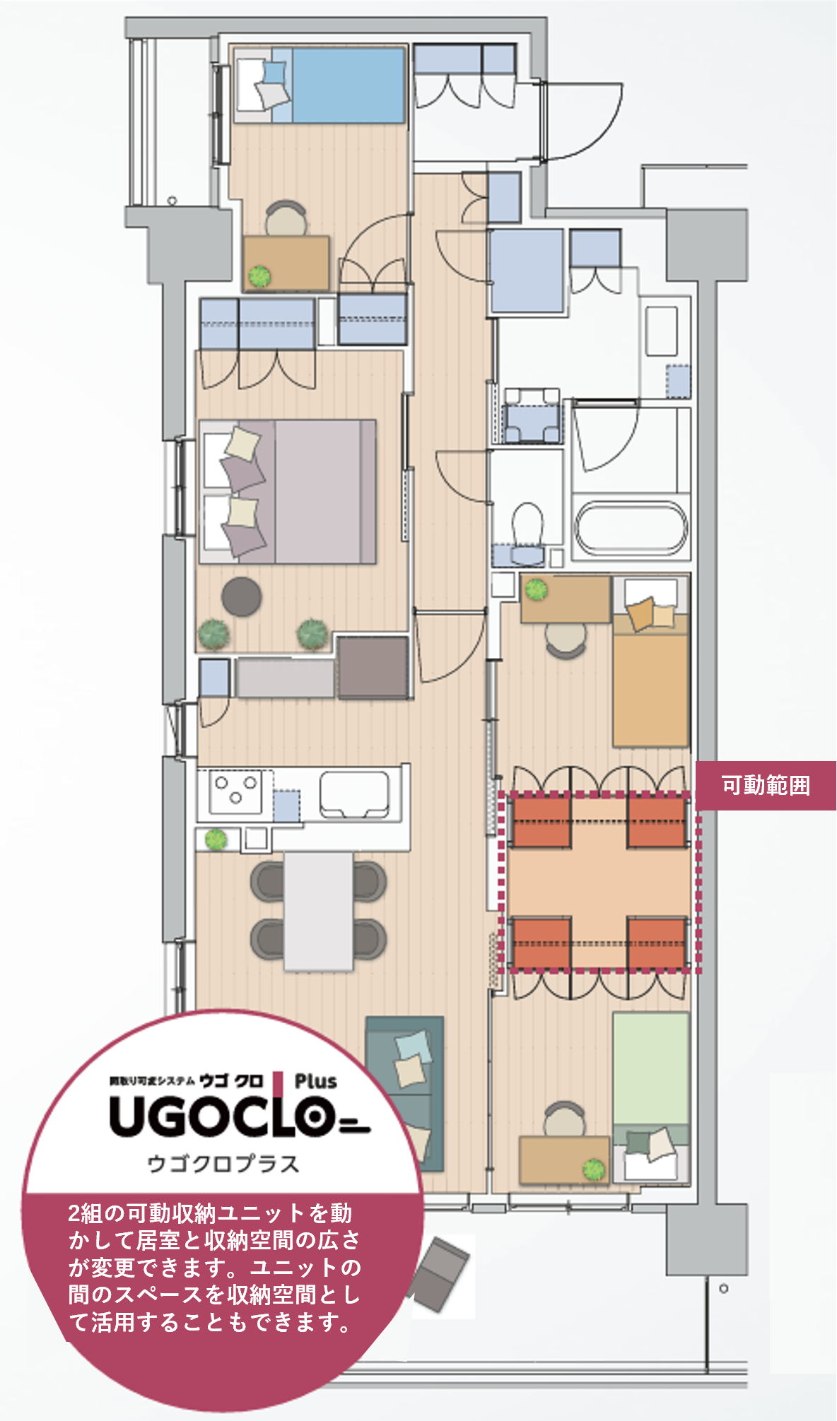 長谷工グループが独自開発した可動収納ユニット「UGOCLO Plus(ウゴクロ プラス)」(2列可動)を一部住戸(10戸)に採用。子供の成長やテレワークなどライフスタイルに合わせて居室や収納の空間の自由度を高めます。