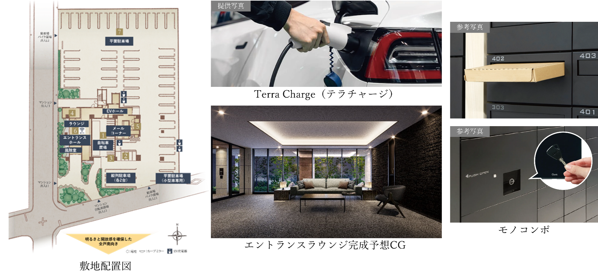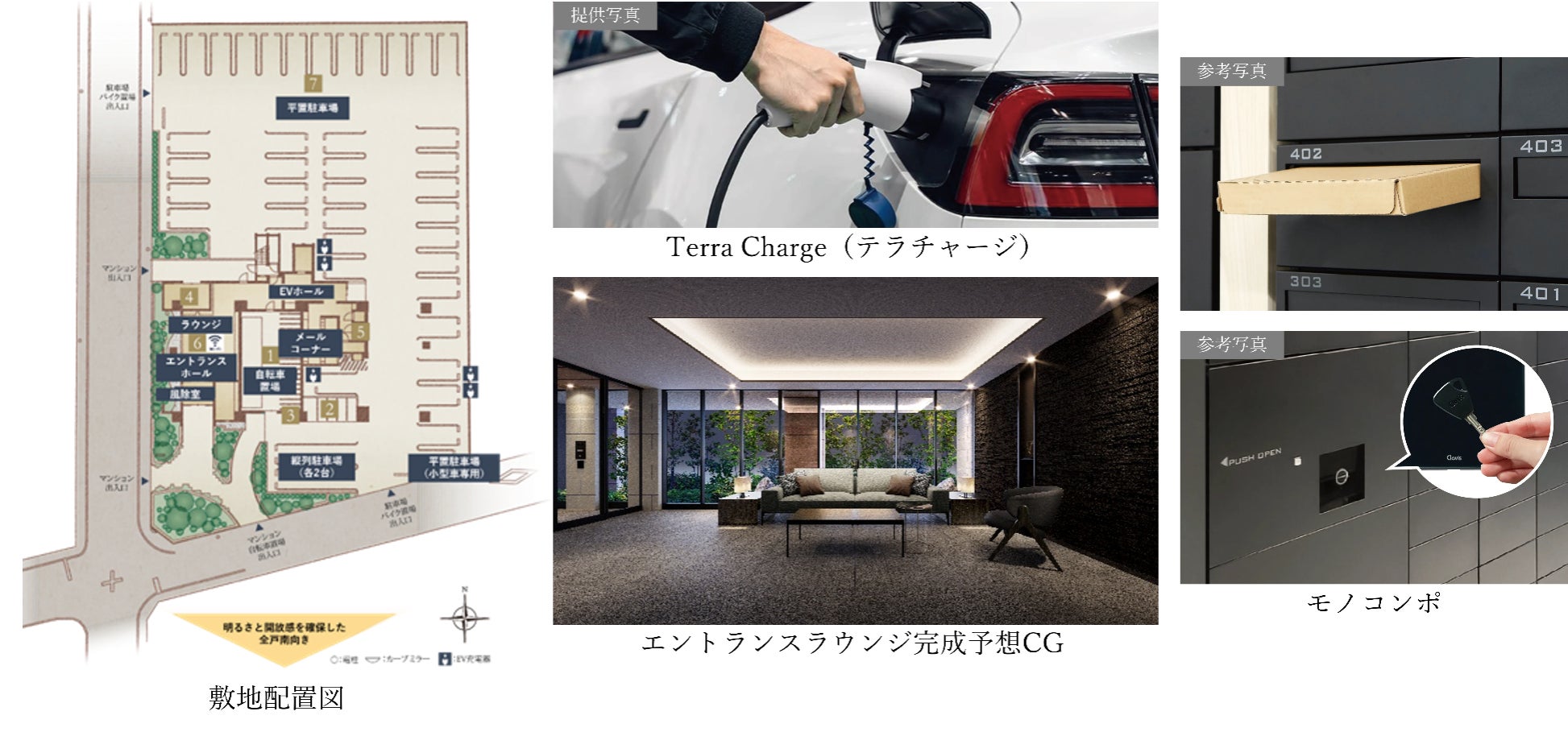 敷地内に全戸分以上の平置き駐車場を設置し、電気自動車(EV)向けの充電サービス「Terra Charge(テラチャージ)」を導入しました。エントランスラウンジはシックな装いで、メールコーナーには住戸キーで荷物を取り出せる、ポストと宅配ボックスを一体化した「モノコンポ」を採用しました。