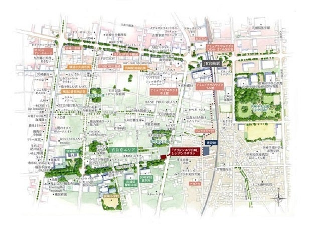 JR「宮崎」駅周辺は商業エリア・官公庁エリア・住宅エリアに分かれており、本物件は官公庁エリアにほど近い住宅エリアに位置します。周辺には生活利便施設が多く、スーパー「ナガノヤ」まで徒歩3分、駅前の「アミュプラザみやざき うみ館」まで徒歩7分で日常の買い物から外食・ショッピングまで充実した環境です。また「宮崎中央公園(文化の森)」まで徒歩5分、「宮崎県庁」まで徒歩10分と、自然豊かでありながら利便性も兼ね備えた立地です。