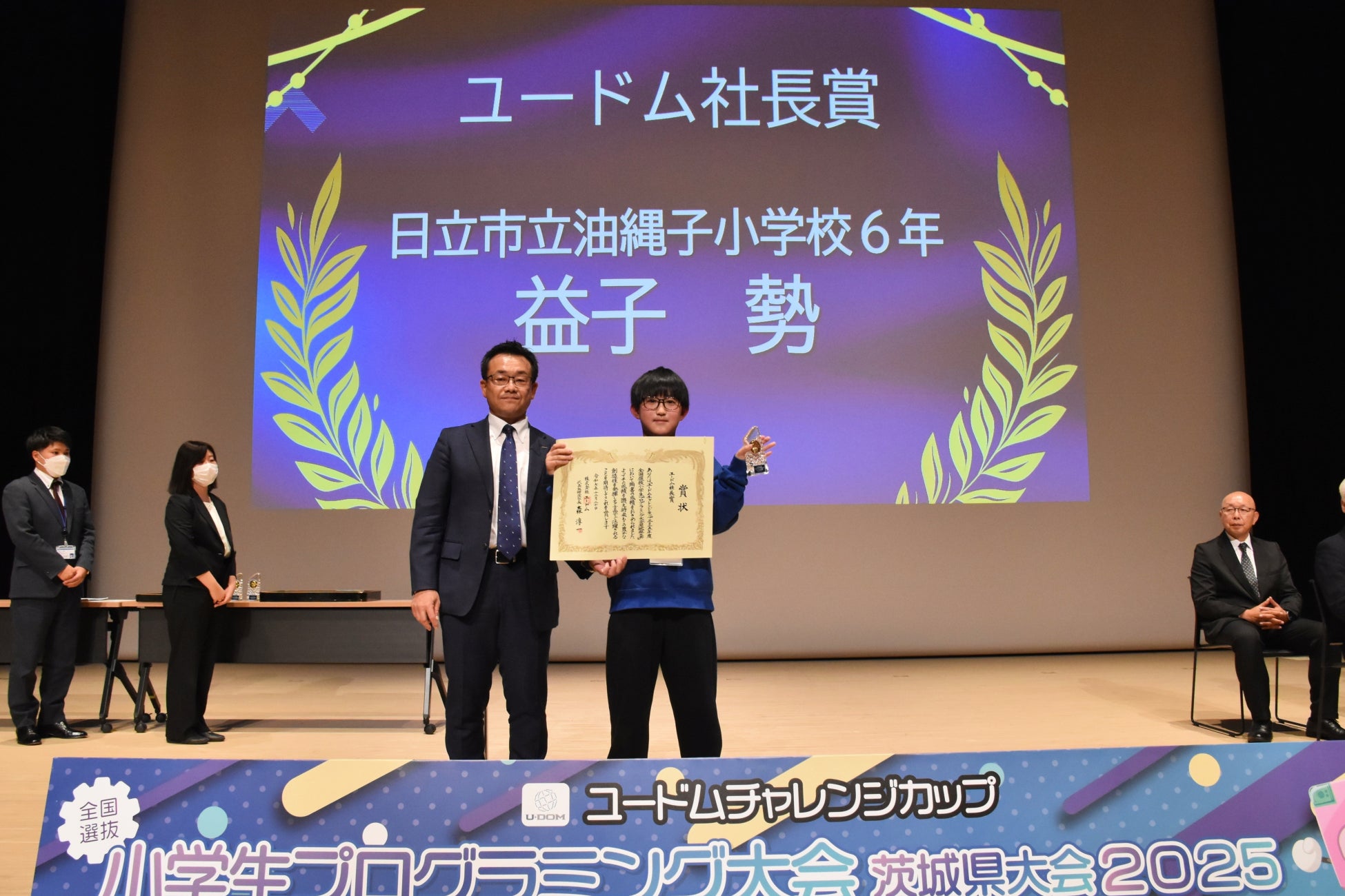 また、「かつおのAIレストラン経営物語」という、独自の視点と技術力が光る作品を作られた日立市立油縄子小6年の益子勢さんには、「ユードム社長賞」を授与させていただきました。
