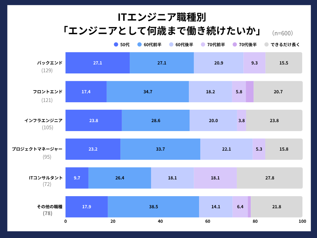 職種別に見たところ、「できるだけ長く働きたい」と回答した割合が最も高かったのはITコンサルタント(27.8%)で、他の職種を上回りました。次いでインフラエンジニア(23.8%)、フロントエンドエンジニア(20.7%)が続き、顧客対応や運用支援といった、経験を積むほど価値が高まる職種で長期就業意向が強い傾向が見られます。