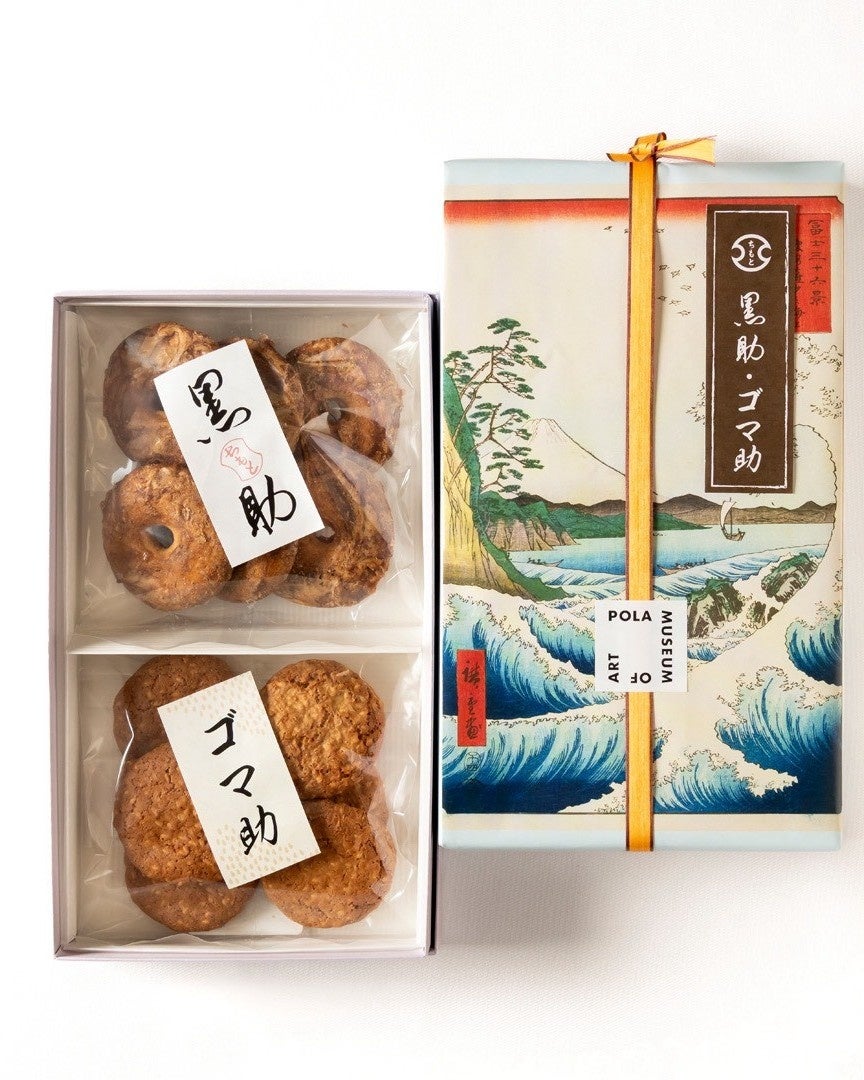 商品は2種類、ちもとの看板銘菓「湯もち」を含む「湯もち・八里」 豊原国周 《箱根七湯之内 塔ノ澤》、およびビスケット生地の御菓子を詰めた「黒助・ゴマ助」 歌川広重 《冨士三十六景 駿河薩夕之海上》のご用意です。