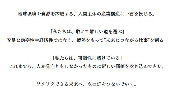 VISIONの一貫性:「環境と人の関係性に異端な解を実現し続ける」を創業以来掲げ、災害からの復活や事業拡大を経てもぶらさず継続。
