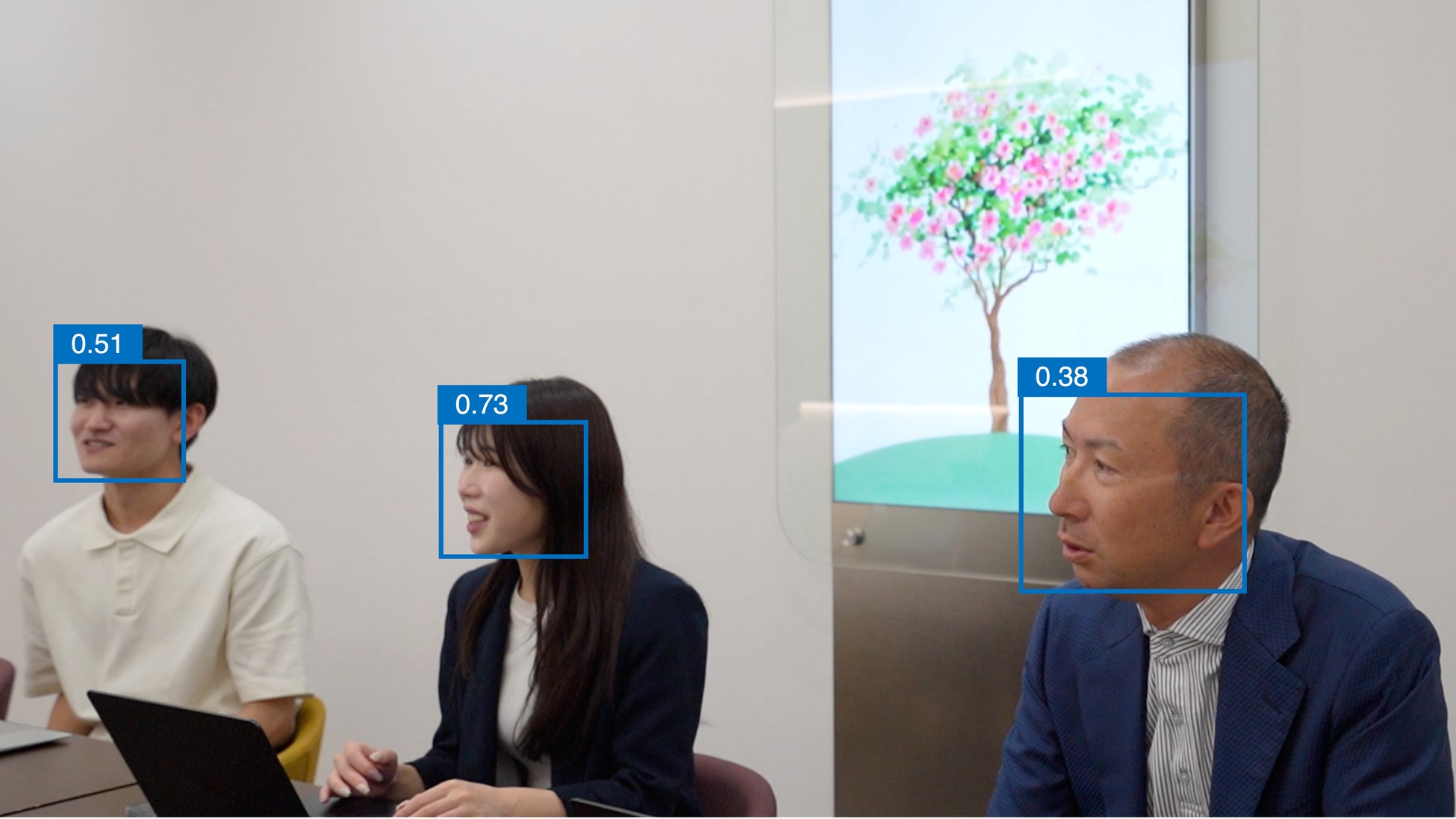 カメラで取得した会話量や笑顔の度合いに応じ、生成AIが約4分ごとに“木のアート”を1本生成し、会議室内の大型サイネージへ表示。雰囲気が悪いと“雨”、時に“動物”の演出で場を和らげるなど、会議状態を自然なインタラクションとして可視化・体験できます。