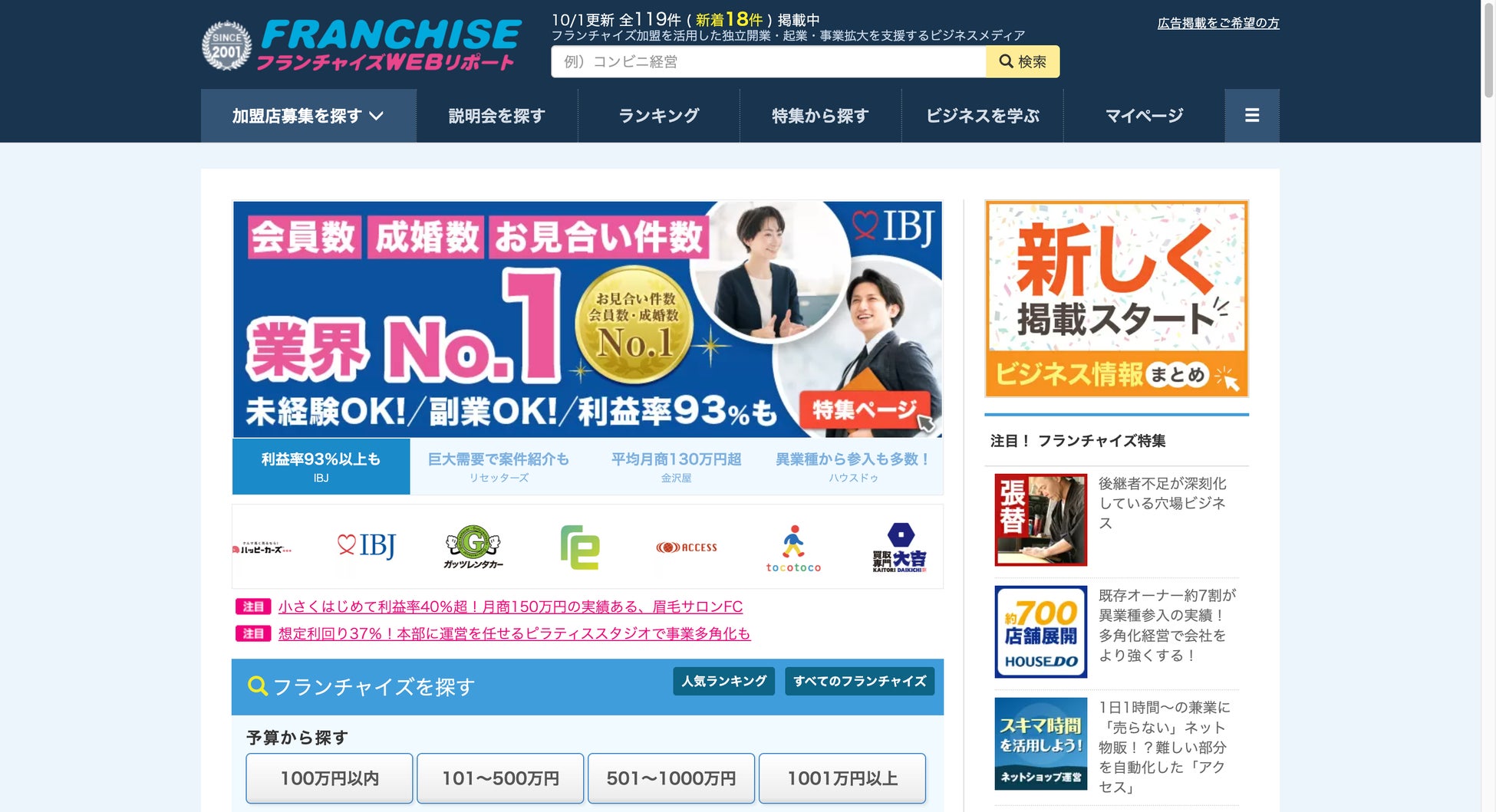 独立・開業・起業・多角化の検討者に向け、フランチャイズ募集情報と編集記事を提供する日本最大級のフランチャイズ比較メディア。予算や業種、エリア、興味関心から探せる導線を備え、資料請求や説明会申込が可能。2001年より一次情報取材に注力し、常時100社以上のパートナー募集情報を掲載。