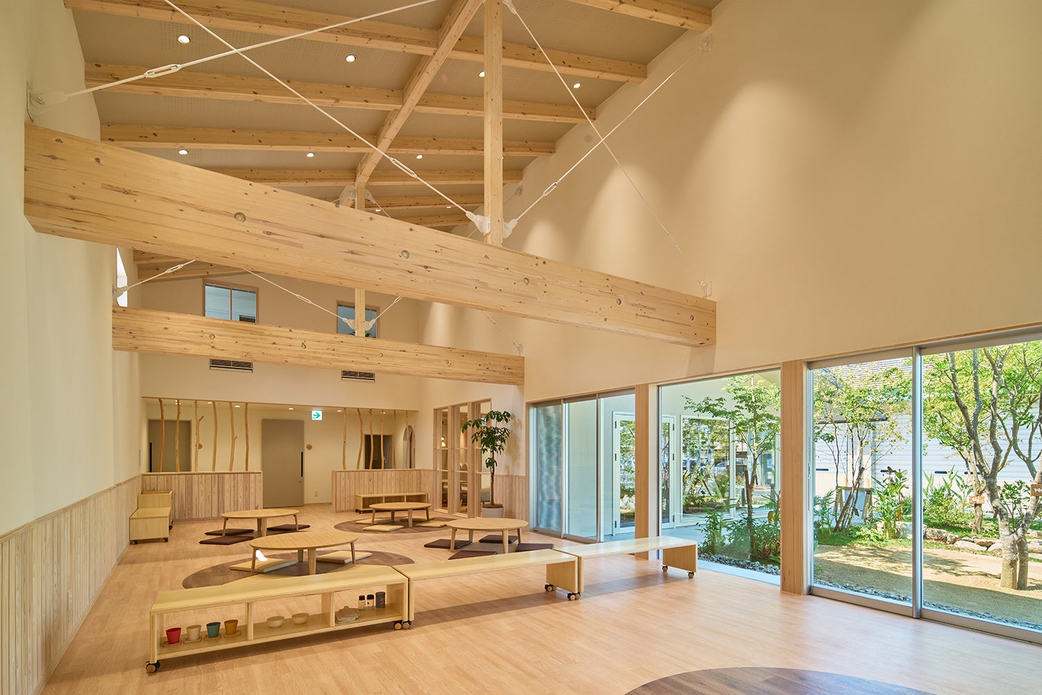 敷地中央に設けたプレイパークを囲むようにカフェ空間を構成し、室内外の連続性を感じられる開放的な設えとしました。