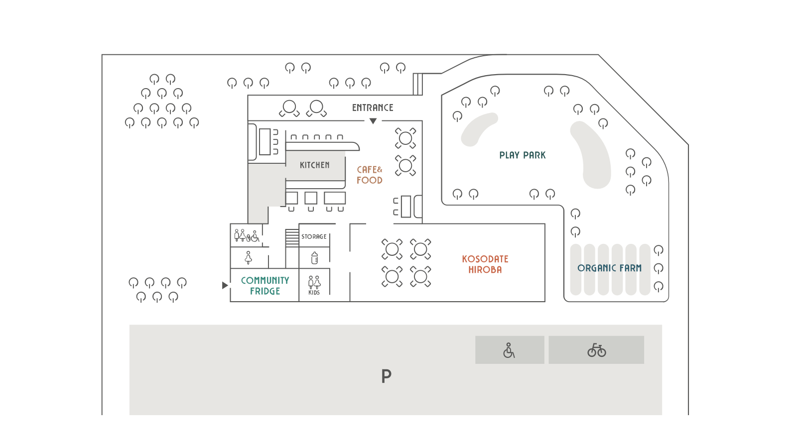 FLATは「食事・子ども・遊び・家族・コミュニティ」の5つを“枝”とし、そロゴに込めた“枝”のコンセプトを空間構成や内装サインに展開し、視覚的・構造的に理念を共有できるデザインを実現しています。また、プレーパークを囲う建築配置により、親子の安心感と見守りやすさを両立。他の子育て支援施設と異なり、カフェ機能を日常の導入点とすることで、気軽に立ち寄れる共育空間を構築しています。加えて120種以上の植栽やベビーフレンドリーな設備を備え、子育て世帯が日常的に交流できる複合施設として、地域の共育環境を形にしました。