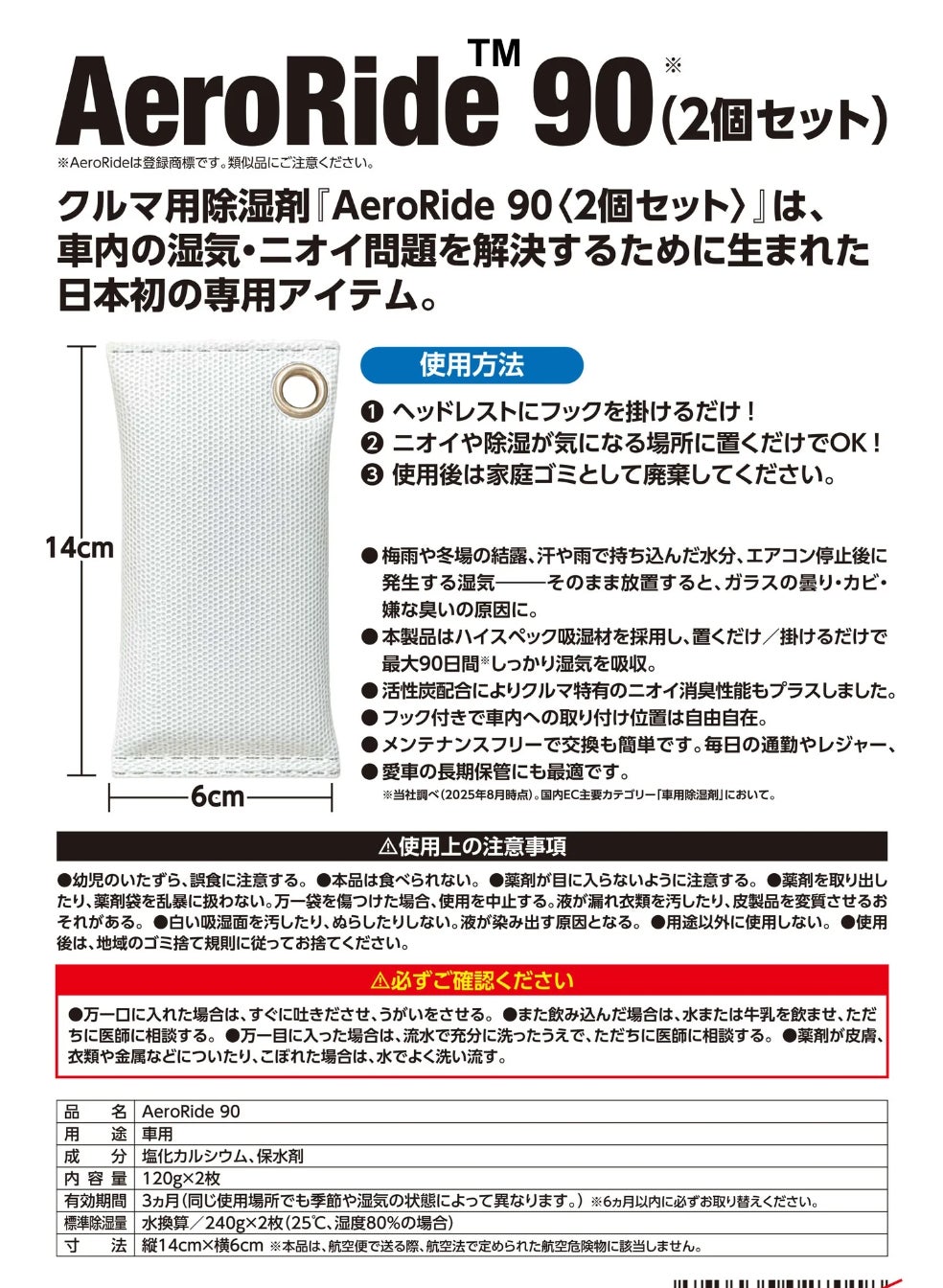 ※1...「日本初」表記について。車内専用の除湿剤として2025/08 AeroRide合同会社調べ。