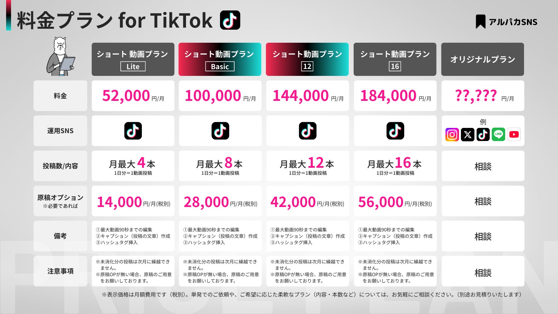アルパカSNS for TikTokについて|動画投稿をスモールスタートで始めたい、コンスタントに投稿したい方に最適化された料金体系