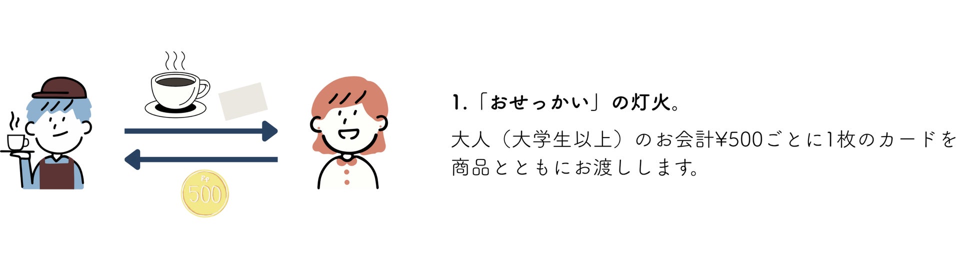 大人(大学生以上)のお客様には、お会計500円ごとに「おせっかいカード」を1枚お渡しします。