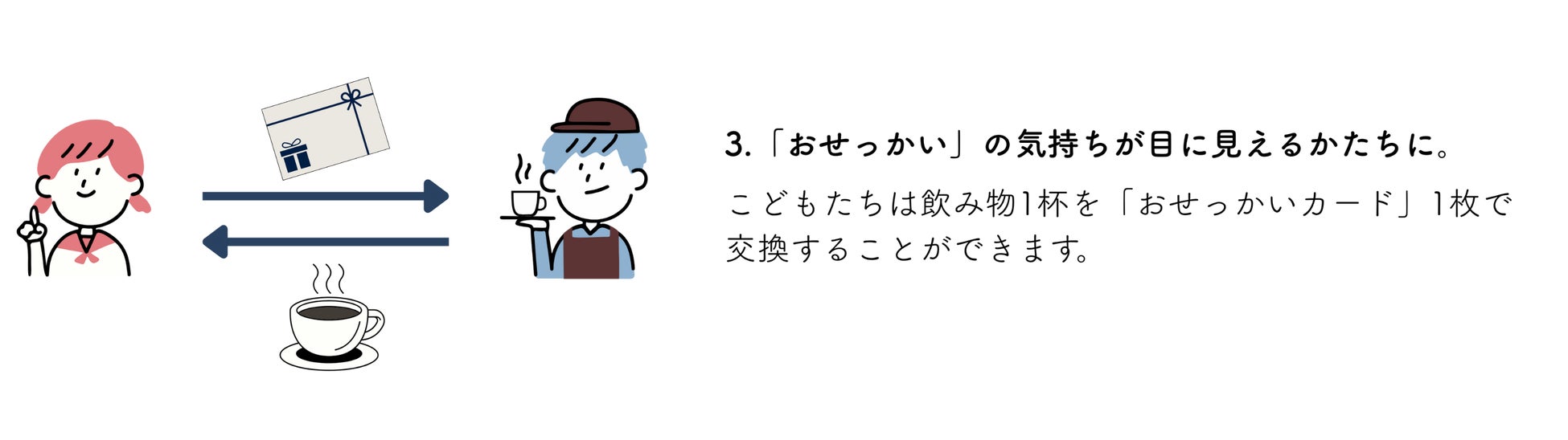 大人(大学生以上)のお会計500円ごとにカードを1枚進呈。メッセージを書けば、こどもが1杯のドリンクと交換できる「おせっかいカード」に。大人のやさしさが、まちをめぐる新しい仕組み。