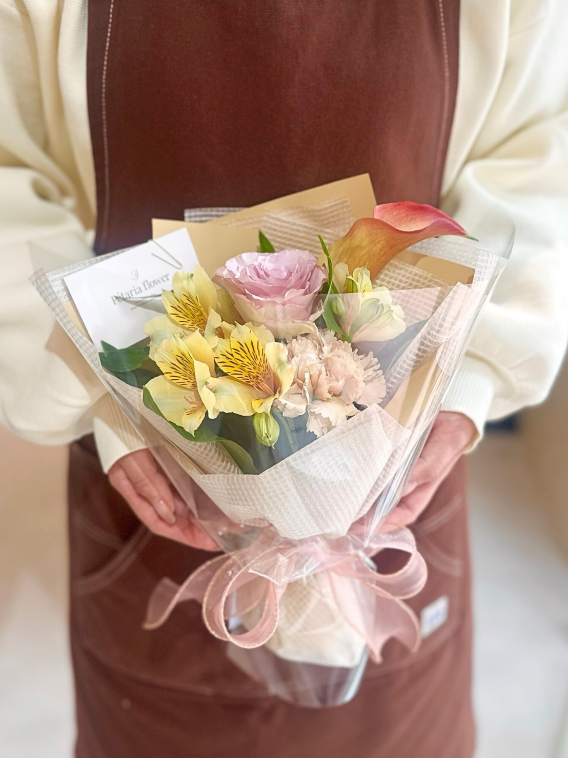 花の色合わせ、ラッピング、リボン選びまでトータルで美しい仕上がりに。淡く繊細な印象であるPetaria flowerらしさと、お客様のご希望が両立する、世界でたった一つの花束をお作りします。