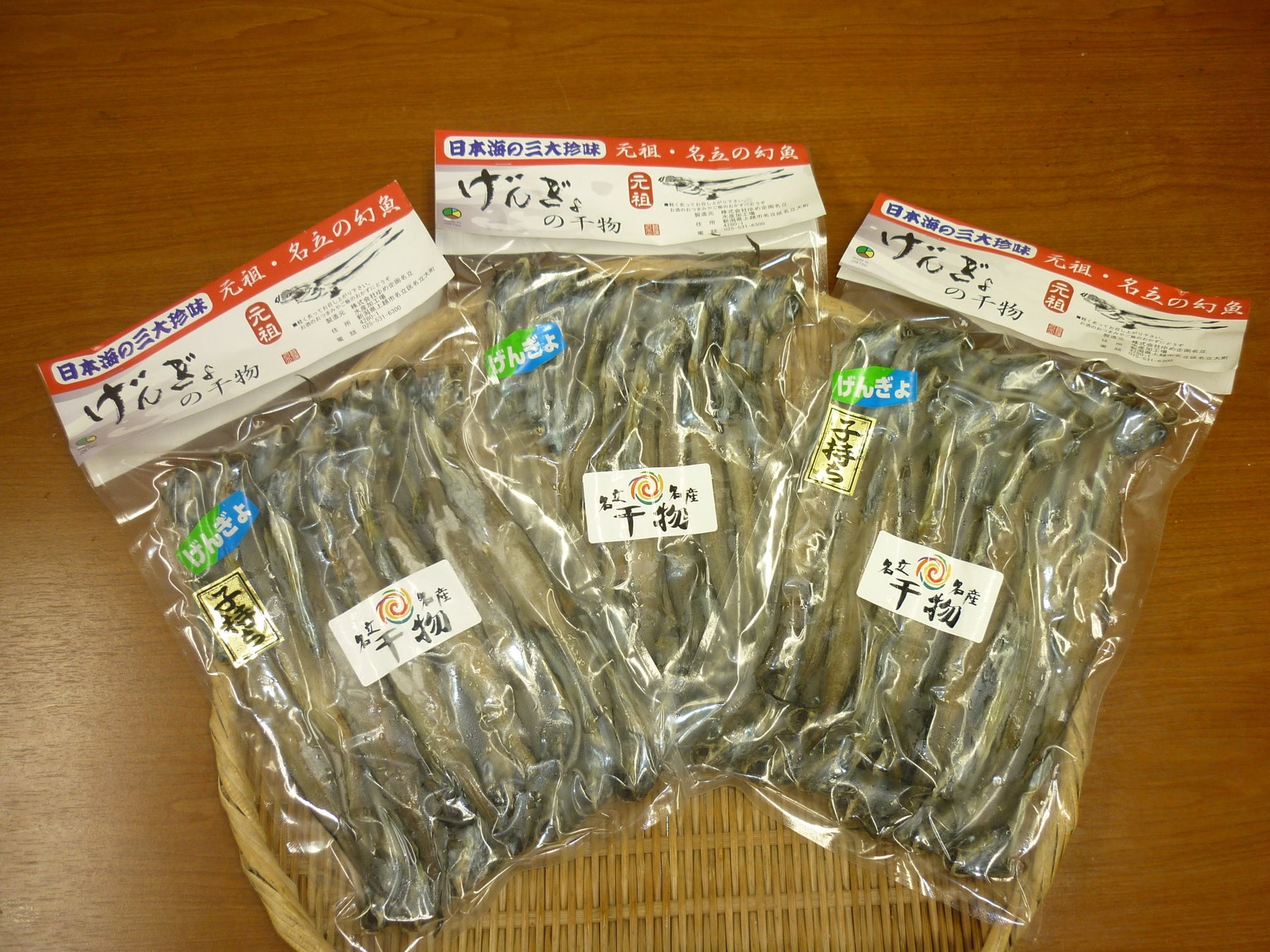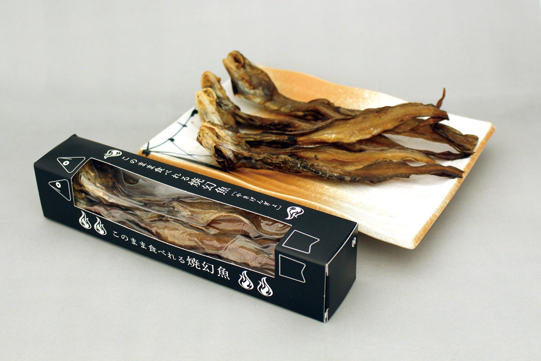 「焼幻魚」(やきげんぎょ)は上越市名立沖で獲れた新鮮な幻魚を丁寧に乾燥させて美味しく焼き上げた商品です。寒風干しに近い方法で干物にし、さらに焼いて真空パックにしました。