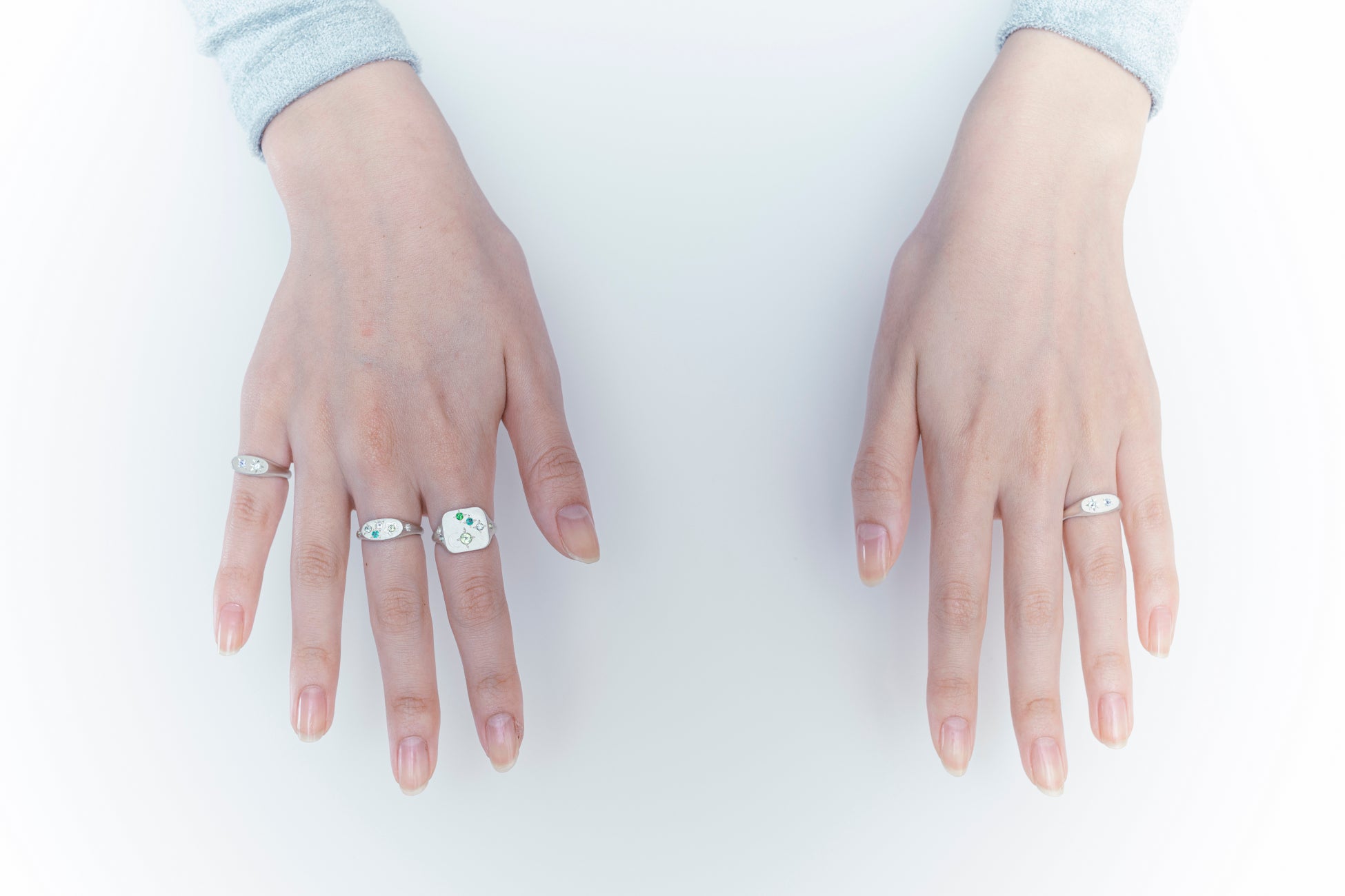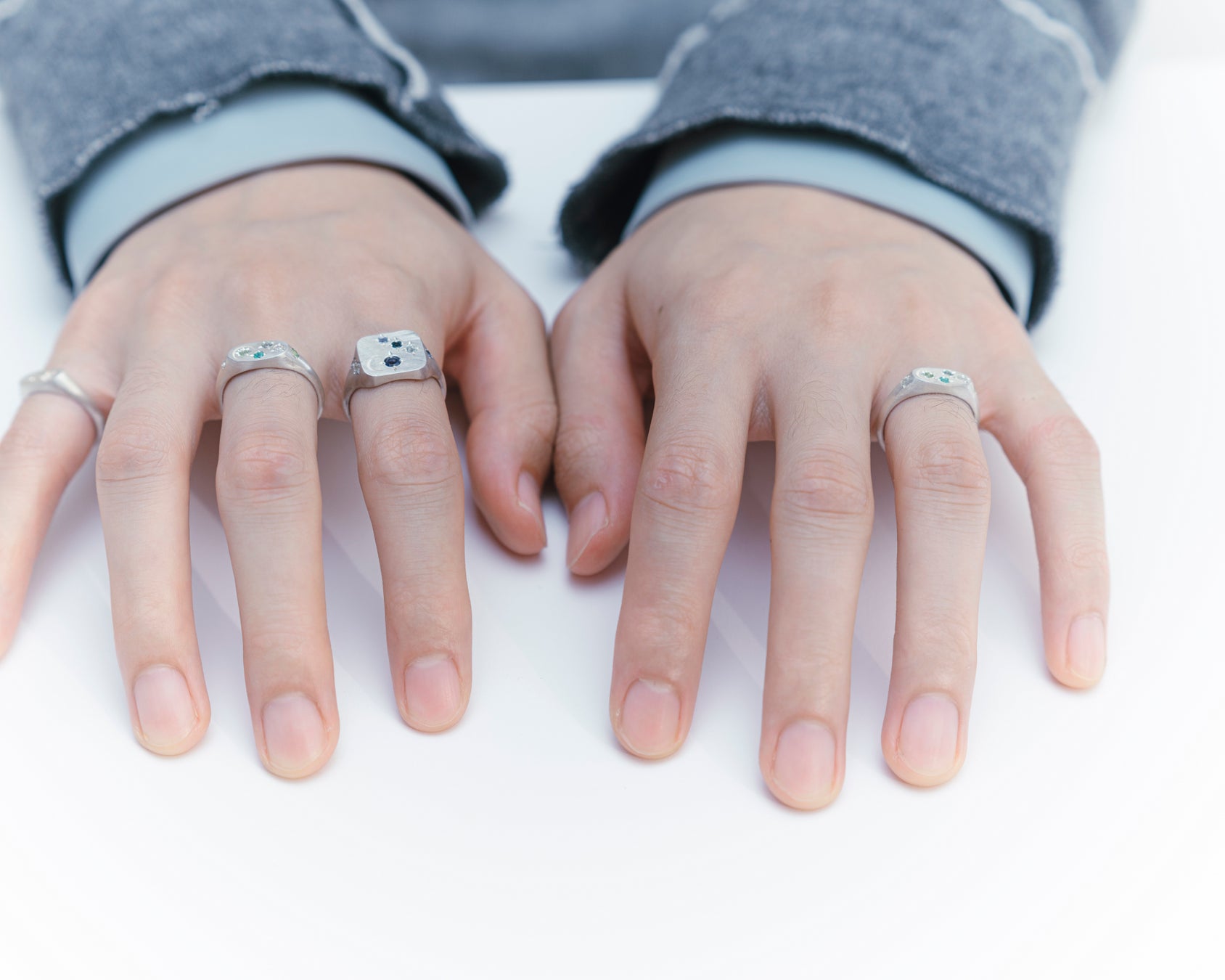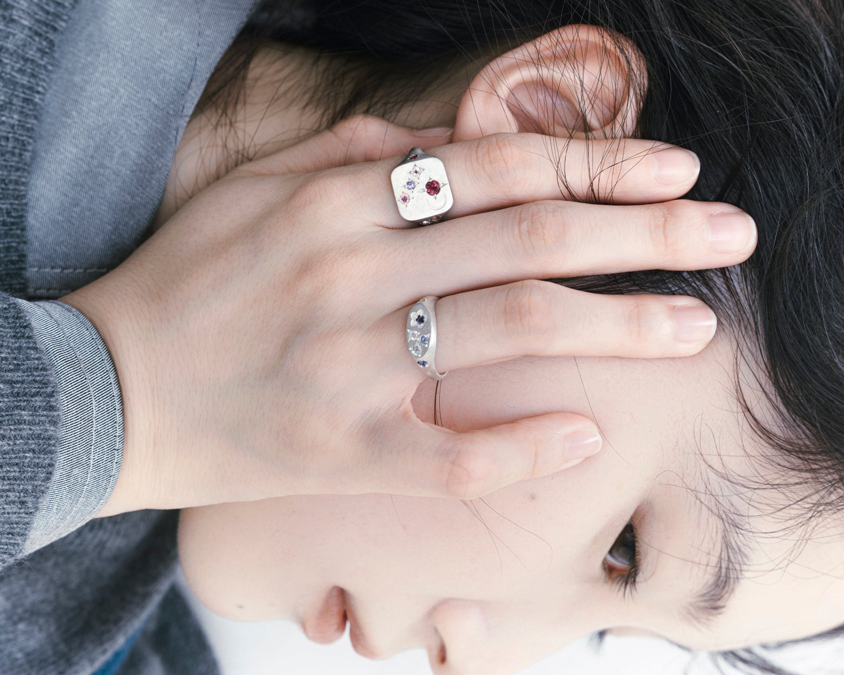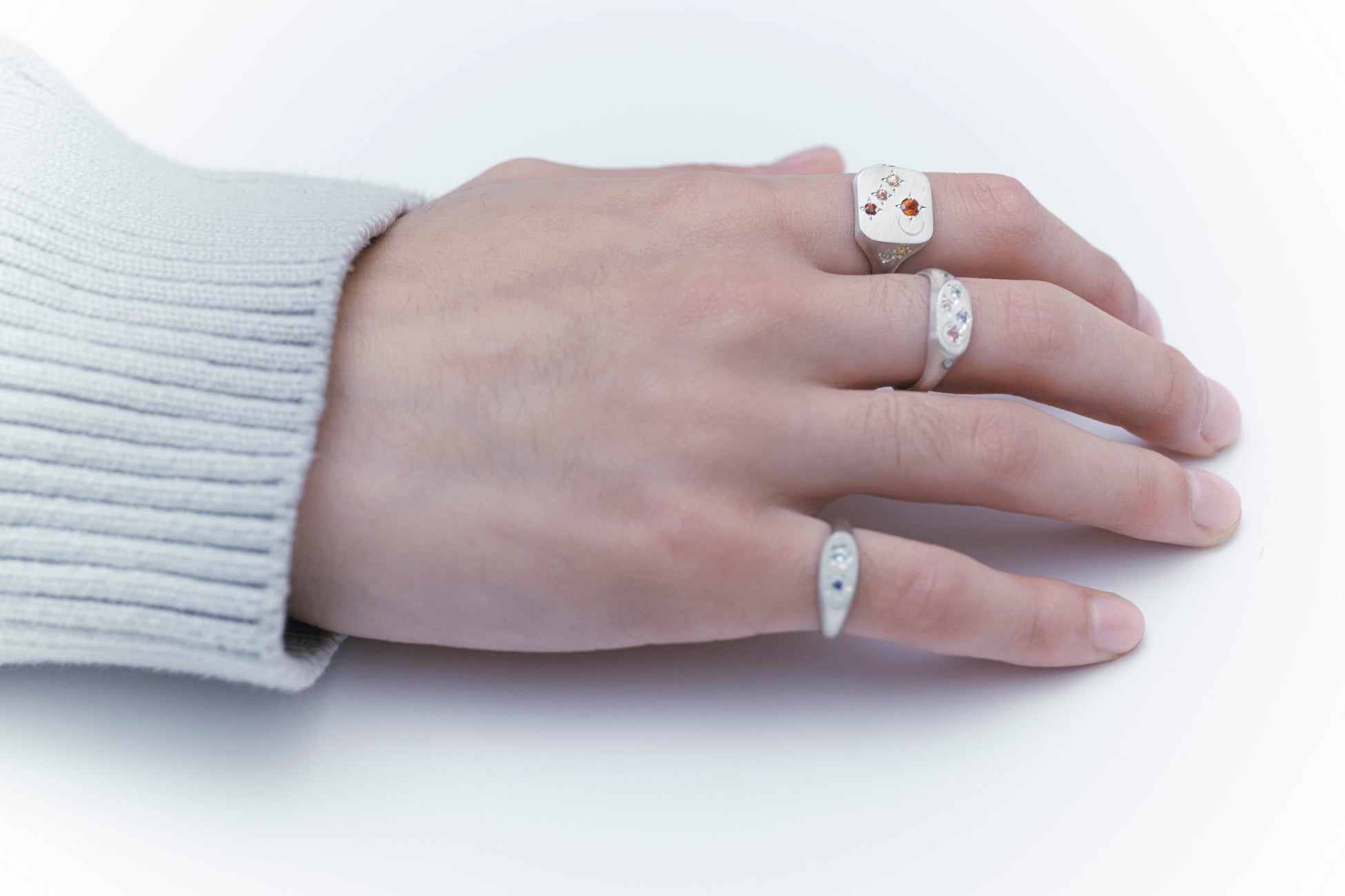 ブランド初のコレクション「Debut Collection」では、サファイアやトルマリンなど多彩な天然石を用いたシグネットリングを中心に展開しています。
