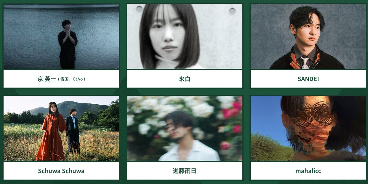今年のフジロックフェスティバル出演でも話題の新進気鋭バンド雪国からVo、Gtの京 英一を始め、J-Wave「TOKIO HOT 100」へのチャートインや、サブスクリクションサービスの人気PLAYLISTに多数ピックアップされるなど、新人として異例のヒットを記録したユニット、Schuwa Schuwa。東京を拠点に活動、ヒップホップに影響を受けながらも、様々なジャンルの⾳楽を取り⼊れたユニークなサウンドに定評があるR&Bシンガー、SANDEI。東京・下北沢を拠点にライブ活動を行い、フリージャズやクラブミュージック・ベッドルームポップから発展し観客の外国人をも熱狂させる来白、天性のスモーキーボイスを活かした 叙情的な歌詞と、繊細かつキャッチーなメロディラインで全国のフェスで話題になりつつあるシンガー、進藤雨日。「今年観ておいてよかった」というアーティストが勢揃いします。