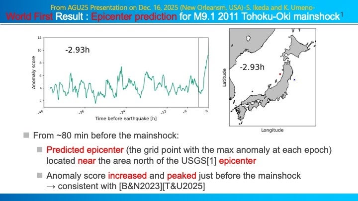 学会発表: 世界初の震央推定としてAGU25(American Geophsyical Union 2025, New Orleans, USA)で、2025年12月16日に口頭発表(S. Ikeda-K. Umeno)するとともに、その直後の12月20日には東京で開催された日本地震予知学会で招待講演(梅野健)にて紹介しました。