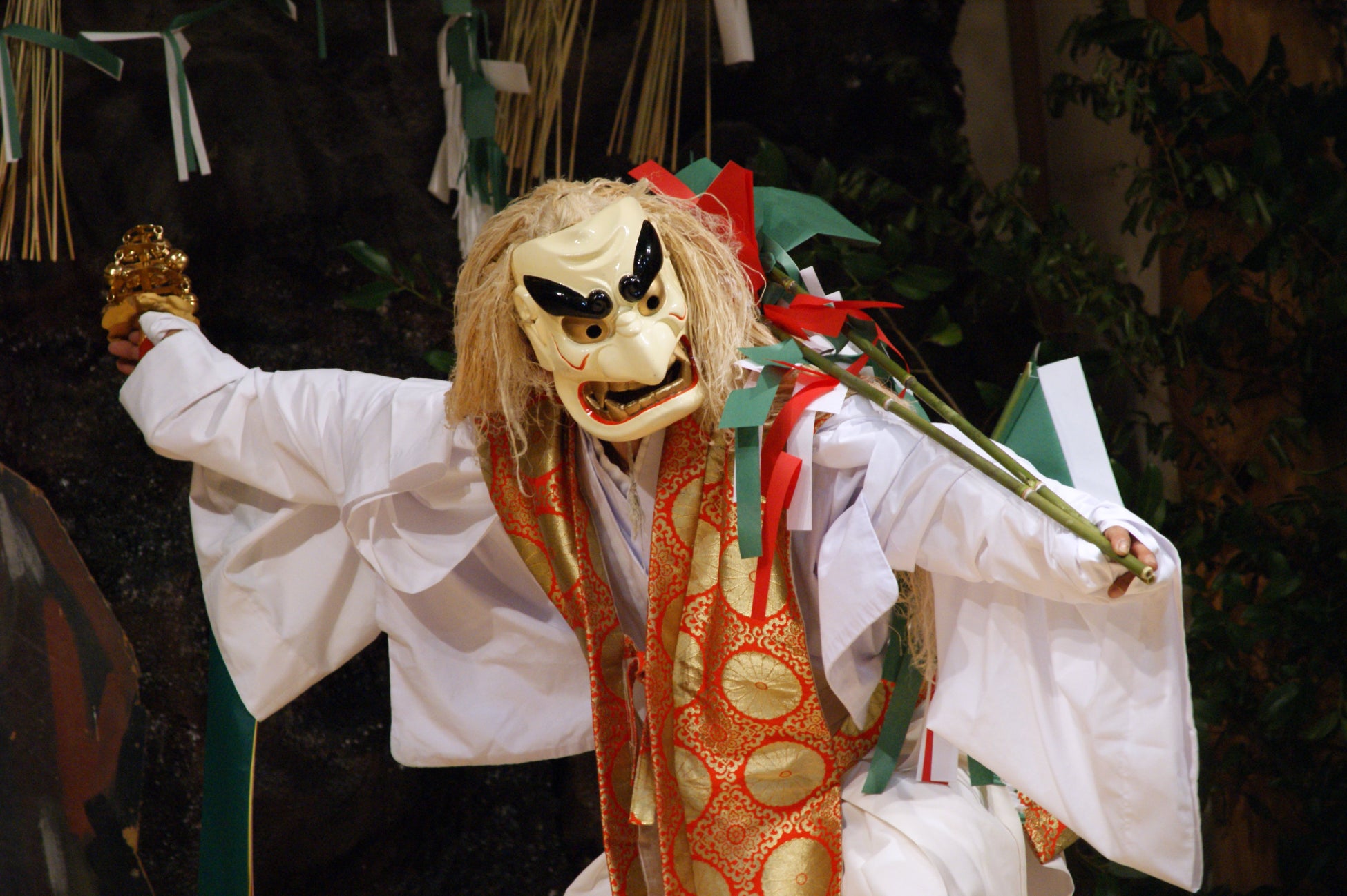 夜神楽とは、里ごとに氏神様を神楽宿と呼ばれる民家や公民館にお招きし、夜を徹して三十三番の神楽を奉納する、昔から受け継がれてきた神事です。各集落の夜神楽は天照大神をはじめ、日本の神話や伝説の中に登場する神々が多く総出演します。夜を徹して三十三番の神楽を奉納する「高千穂の夜神楽」は、昭和53(1978)年に国の重要無形民俗文化財に指定されました。