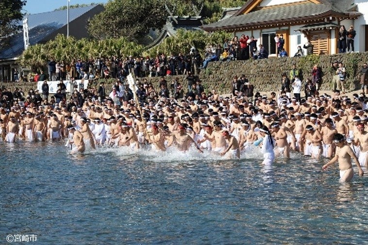 その昔、彦火火出見命(ひこほほでみのみこと)が、海神国から帰国された際、村の人々が衣服をまとう暇もなく赤裸の姿で取り急ぎお迎えしたという古事から起こったものです。寒風を突き海水の中で身を清める神事であるこの禊は、全国的にも珍しく貴重なものです。現在、神事は従来どおり残し、裸まいりのみそぎ行事だけ成人の日の祝日に合わせて開催されています。