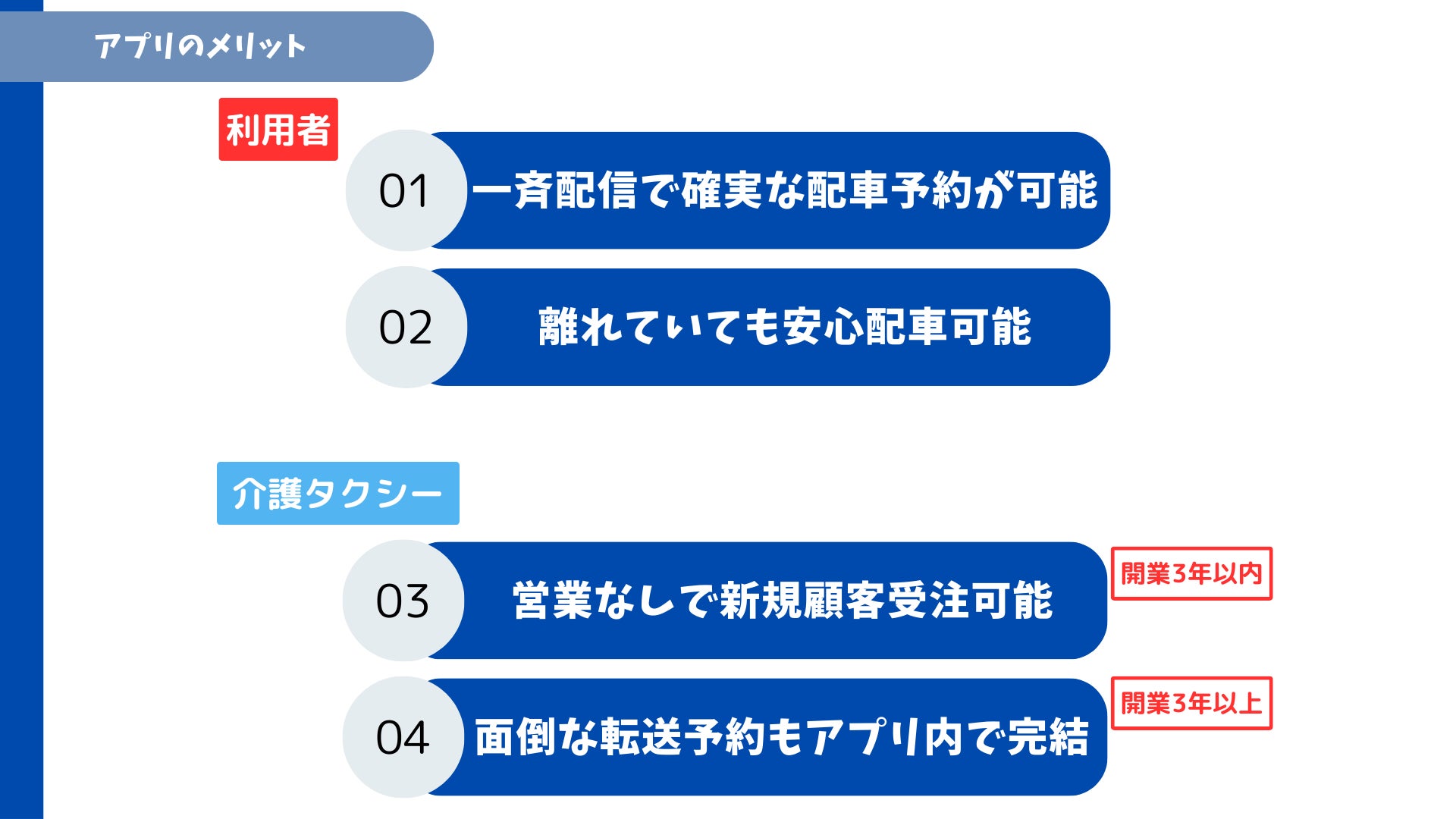 介護タクシー事業者と利用者をアプリ上で直接マッチング