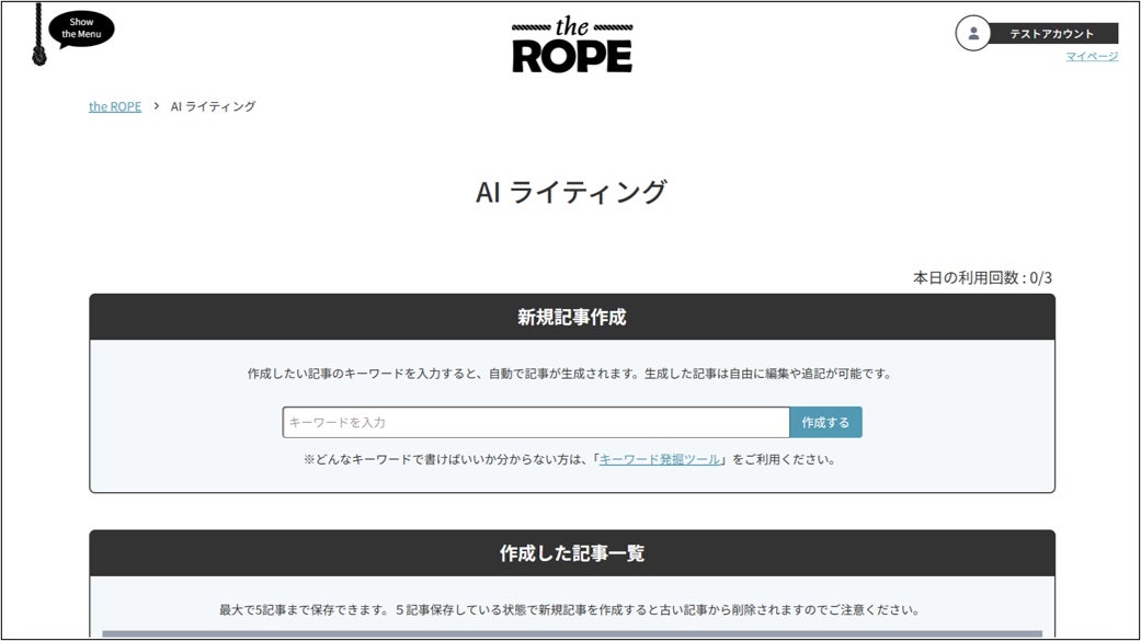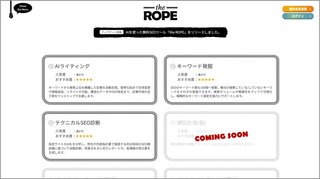東京ウェブ株式会社(本社:東京都港区、代表:清野 剛)は、2025年11月14日、AIを活用してSEO(検索エンジン最適化)に関する煩雑な分析や調査作業を支援するツール「the ROPE(ザ・ロープ)」のベータ版をリリースしました。「the ROPE」は、SEO施策に必要とされる主要な機能を網羅的に搭載し、それらをまとめて無料でAI提供するツールとしては国内初(※自社調べ。2025年10月時点、国内における主要AI活用SEO分析ツールにおいて)となります。まずはベータ版として3つの機能(AIライティング、施策キーワード発掘、テクニカルSEO診断)からスタートし、その後1ヶ月に3機能ずつのペースで、順次新しい機能を追加リリースしていく予定です。