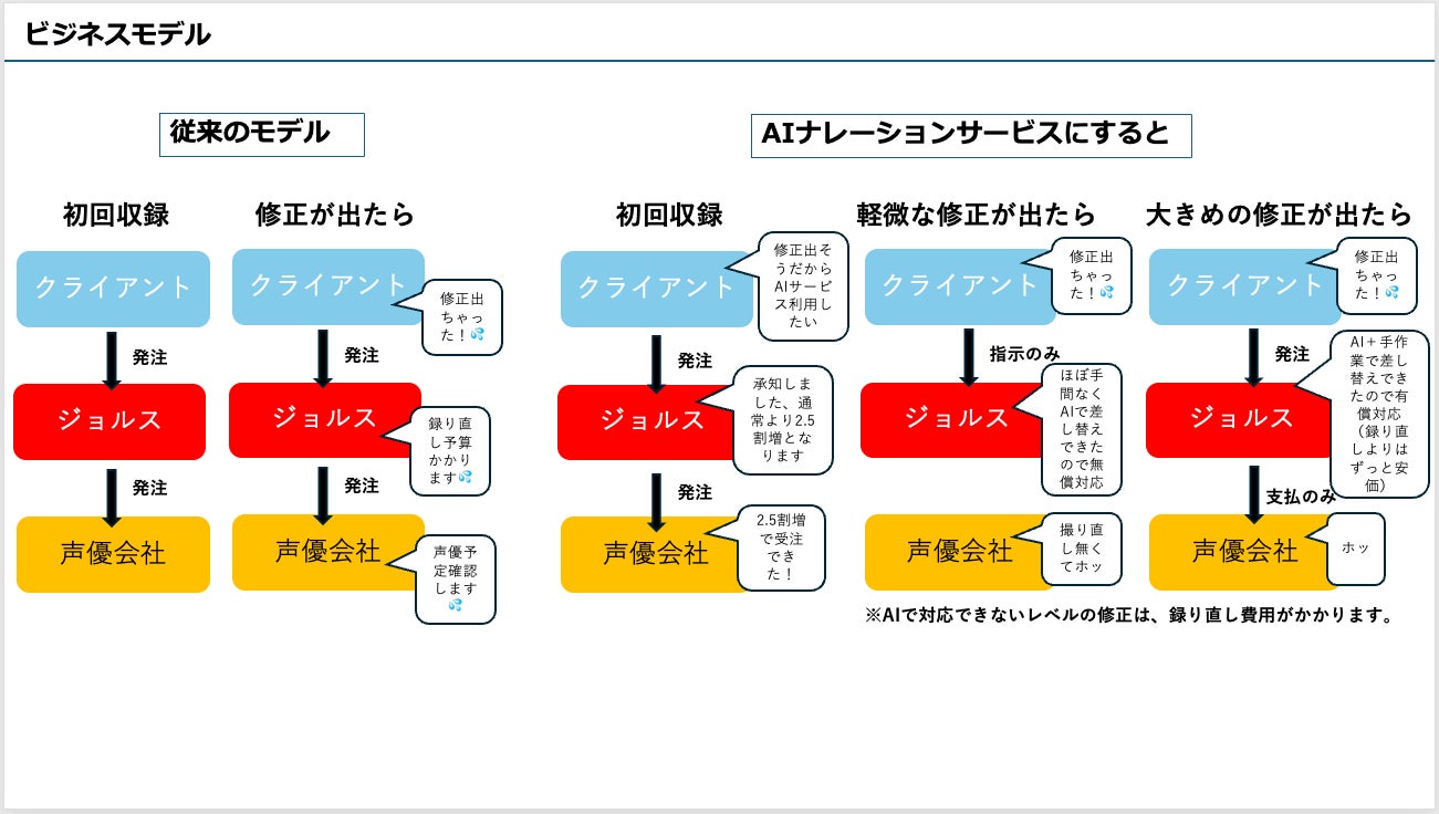 下記が、AIナレーションサービスのビジネスモデルとなります。クライアント、声優プロダクション、ジョルス、3者ともにメリットが⽣じます。