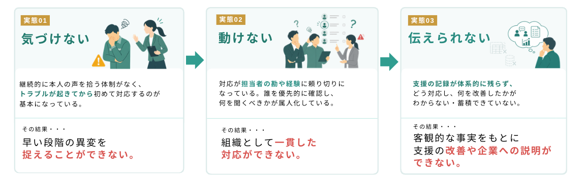 これらは単なる業務効率の問題ではなく、離職・転籍・信頼低下につながる経営課題でもあります。