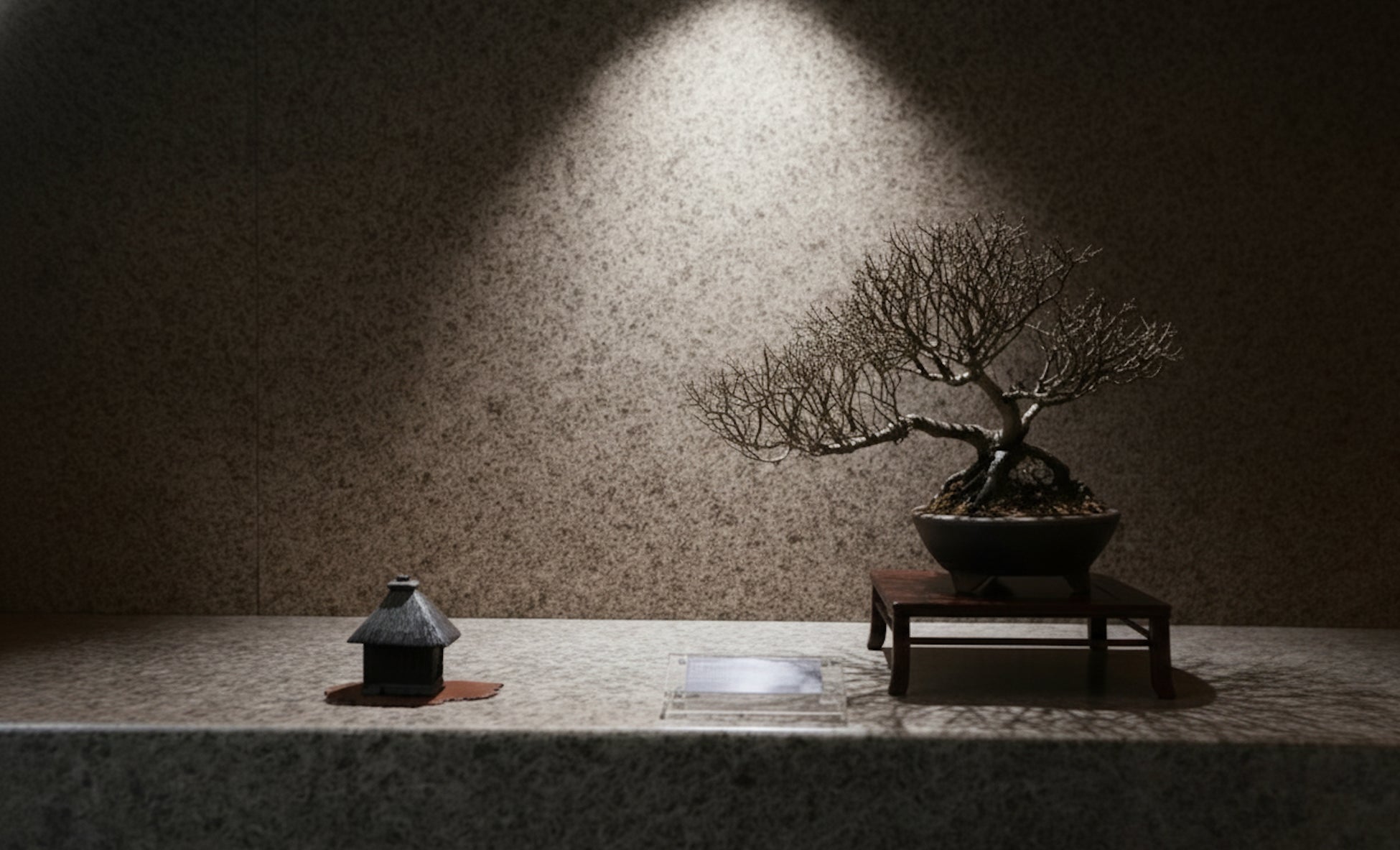 「無垢-MUKU-」は、命を終えた盆栽の痕跡を“静謐の美”として昇華した作品。世界中から訪れるゲストに、日本独自の詫び寂びの美意識と、命の記憶を纏う深い時間体験を提供します。