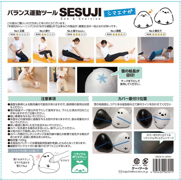 「SESUJI」は、体幹トレーニングを日常生活に取り入れることを目的に開発された製品です。芯材には100%リサイクルポリエチレンを使用し、環境配慮と機能性を両立。さらに、シマエナガをモチーフとしたぬいぐるみカバーを採用することで、フィットネス用品でありながらインテリアとしても違和感なく空間に溶け込むデザインに仕上げています。